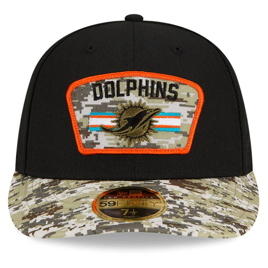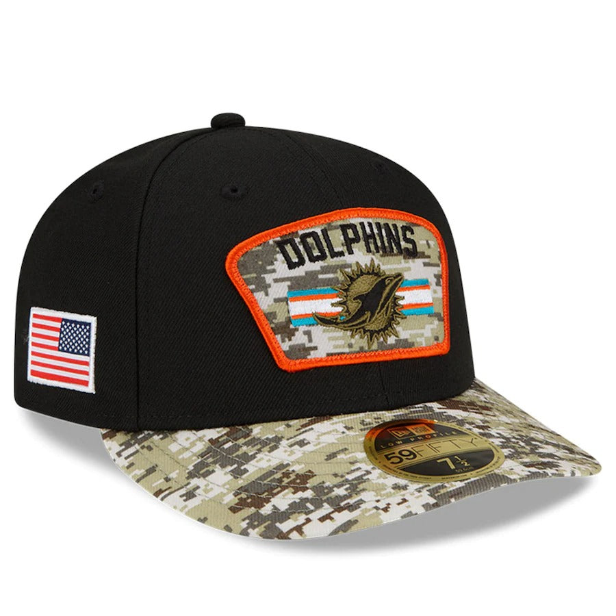 Honor our service members while supporting your favorite team in this year's Official NFL Salute To Service Collection. This two-tone Low Profile 59FIFTY Fitted Hat is constructed of black polyester on the crown and a camo patterned polyester fabric on the visor. The front crown features a fabric applique with custom Miami Dolphins art. This patch uses the same camo fabric from the visor and is surrounded with contrasting team color embroidery. Finishing touches include an embroidered American flag patch on the right wear and the official NFL ''Salute to Service'' patch on the rear. Join your favorite Miami Dolphins players as they wear this cap on the field during the month of November! The NFL does not profit from the sale of Salute to Service products. Charitable contributions are awarded by the NFL Foundation to the NFL's military nonprofit partners. For more information, please visit www.NFL.com/causes/salute.