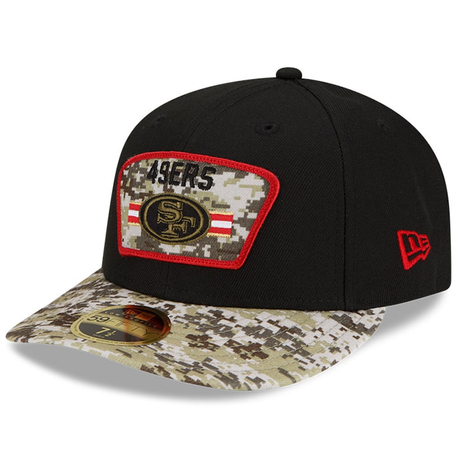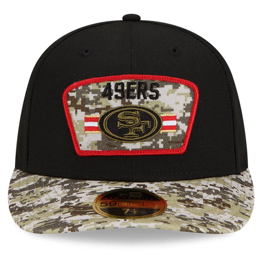Honor our service members while supporting your favorite team in this year's Official NFL Salute To Service Collection. This two-tone Low Profile 59FIFTY Fitted Hat is constructed of black polyester on the crown and a camo patterned polyester fabric on the visor. The front crown features a fabric applique with custom San Francisco 49ers art. This patch uses the same camo fabric from the visor and is surrounded with contrasting team color embroidery. Finishing touches include an embroidered American flag patch on the right wear and the official NFL ''Salute to Service'' patch on the rear. Join your favorite San Francisco 49ers players as they wear this cap on the field during the month of November! The NFL does not profit from the sale of Salute to Service products. Charitable contributions are awarded by the NFL Foundation to the NFL's military nonprofit partners. For more information, please visit www.NFL.com/causes/salute.