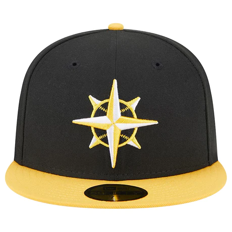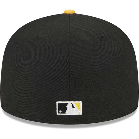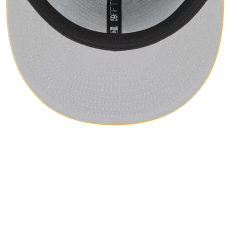 These New Era 59FIFTY fitted hats has a black six panel structured high crown and embroidered eyelets with a gold/yellow tone fabric squatchee button and flat bill. The fitteds have a grey bottom undervisor and with a black sweatband. The front panel logo is embroidered in a black, gold and white colorway and matches the Air Jordan 12 Black Taxi well.