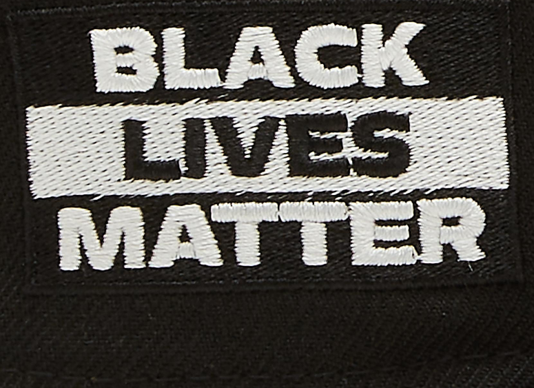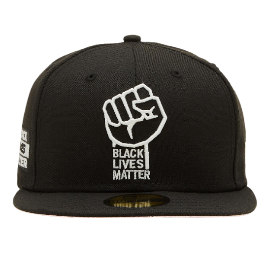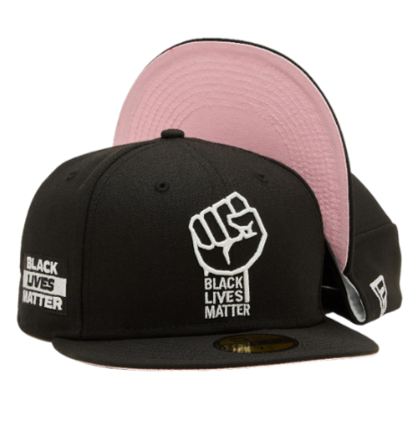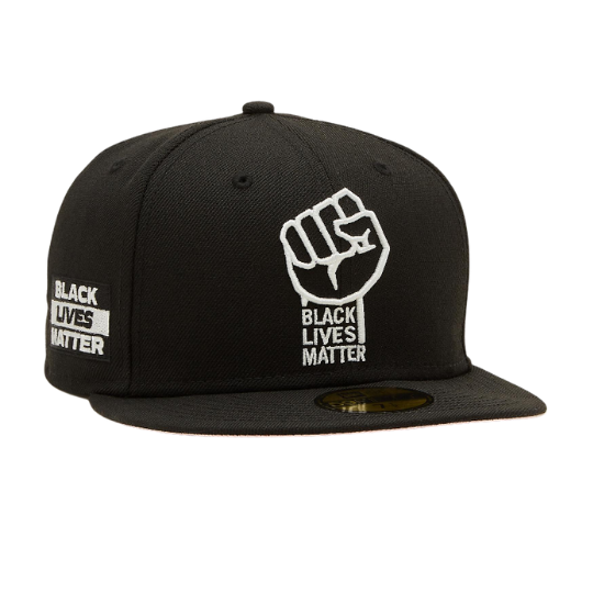 The New Era Black Lives Matter 59FIFTY fitted hat has a black & white colorway. The six panel structured high crown, embroidered eyelets and fabric squatchee button located at the top of the crown are black. The flat brim of the fitted is also black with a pink bottom undervisor (under brim). The front panel features an embroidery of a raised fist and the wordmark "Black Lives Matter" below it in white thread. The right panel features a Black Lives matter side patch. The back of the crown is left blank.