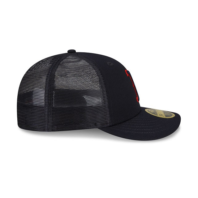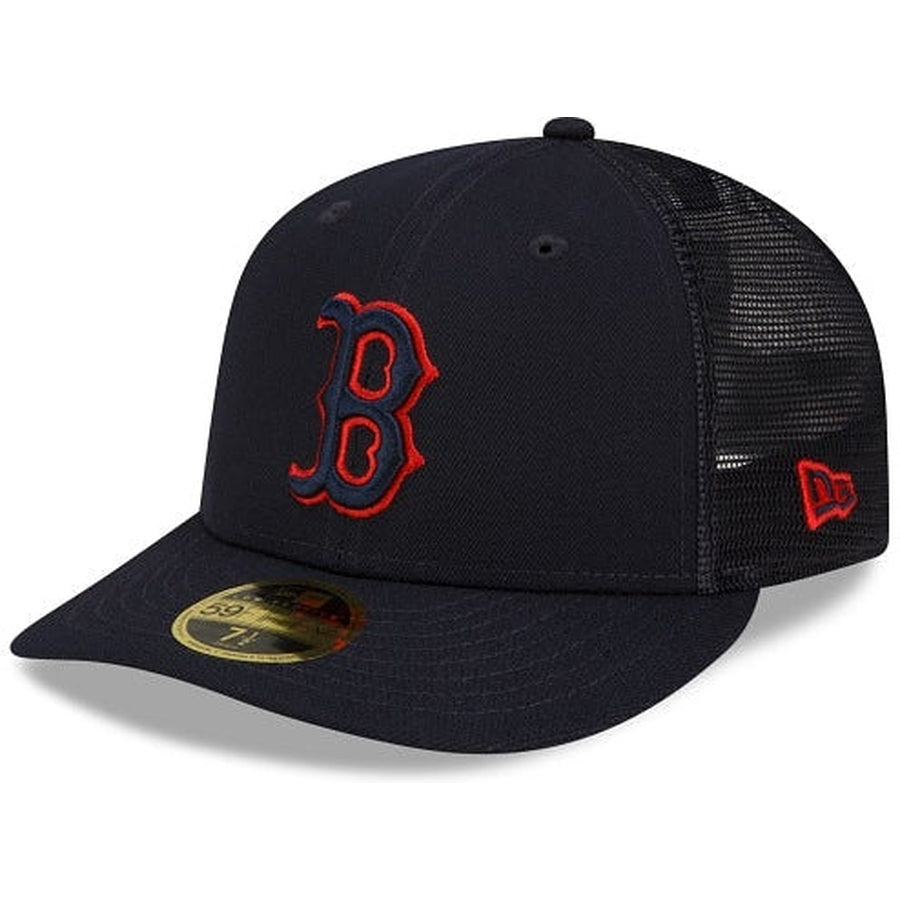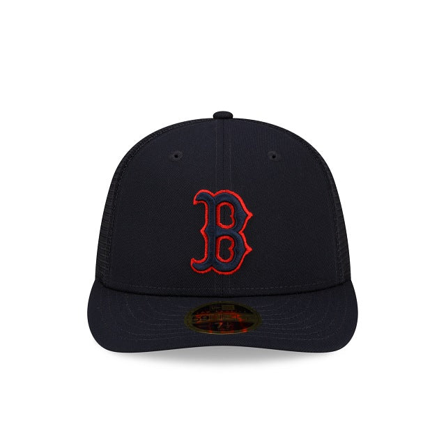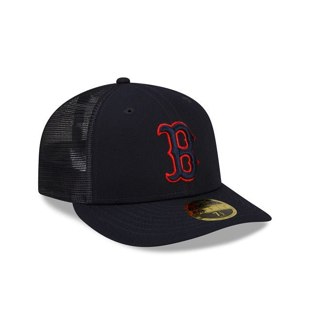 The Boston Red Sox 2023 Batting Practice Low Profile 59FIFTY Fitted Cap features an embroidered Red Sox logo at the front panels with a matching MLB Batterman logo at the rear and a gray undervisor.