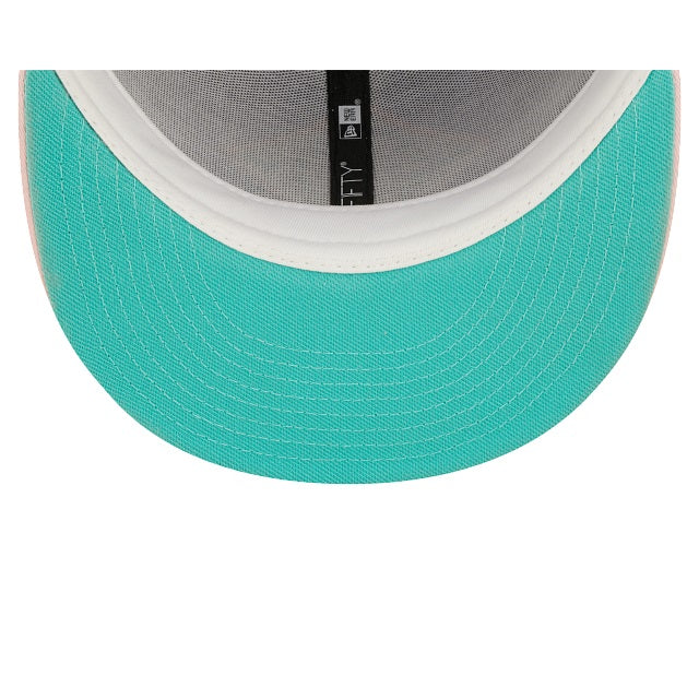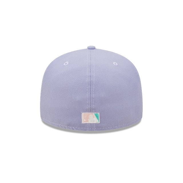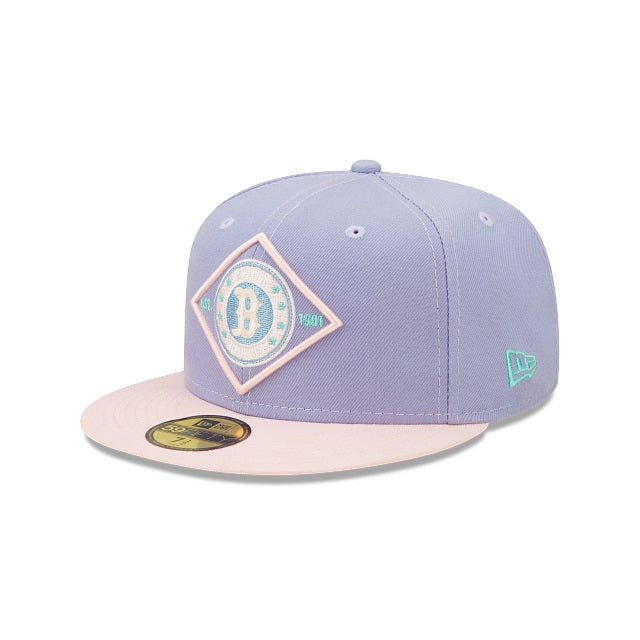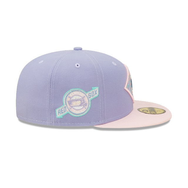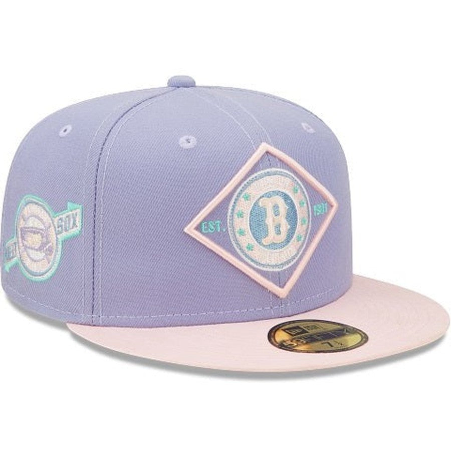 This Boston Red Sox fitted hat was released by Burdeens Chicago. The fitted has a lavender six panel structured high crown and embroidered eyelets with a lavender fabric squatchee button. The flat bill of the cap is soft pink with a teal undervisor and white sweatband. The front panel features the Boston Red Sox logo embroidery and a Fenway Park side patch embroidery on the right panel. The left panel of the fitted displays the New Era logo and the official MLB Batterman logo embroidery on the rear crown.