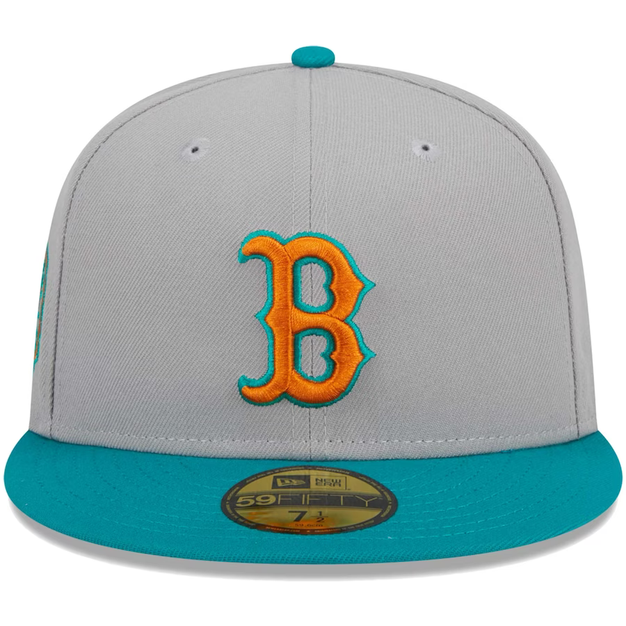 Take your headwear style to new heights effortlessly with this New Era Boston Red Sox Gray/Teal 59FIFTY fitted cap. Displaying your unwavering loyalty to the team is a piece of cake, thanks to the captivating embroidered Boston Red Sox graphics on the crown and a distinctive patch on the side.