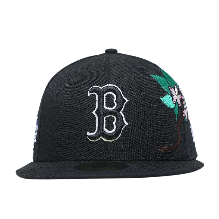 This New Era Boston Red Sox State Flower 2022 59FIFTY fitted hat has a black six panel structured high crown, black embroidered eyelets and a black fabric squatchee button. The fitted cap also has a black flat bill with a black undervisor and black sweatband. The front panel features the Boston Red Sox logo embroidery with a state flower embroidery and a side patch embroidery on the right panel. The left panel of the fitted displays the New Era logo and the rear crown features the official MLB logo embroidery.