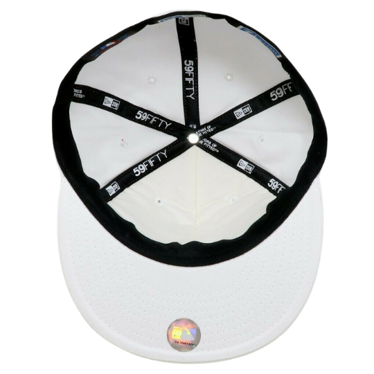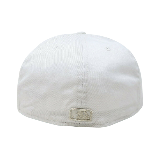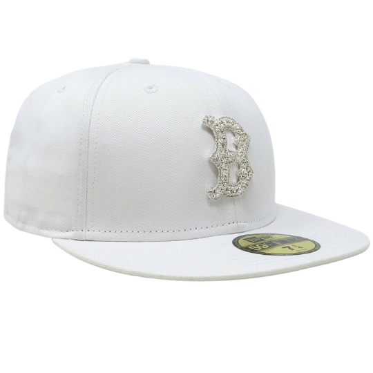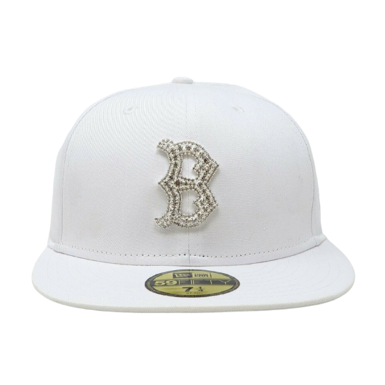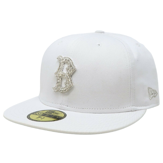 The New Era Boston Red Sox 59FIFTY fitted hat has an all white and silver colorway. The six panel structured high crown, embroidered eyelets, fabric squatchee button and flat bill of the fitted are white. The front features the MLB team Boston red Sox logo in Swarovski crystal. The New Era logo on the left panel and the MLB Batterman logo on the back of the crown are embroidered in silver thread.