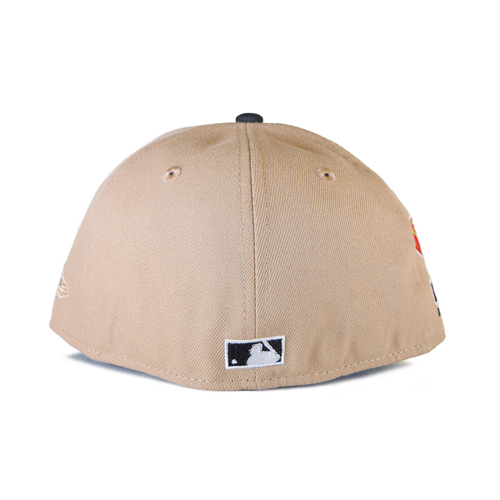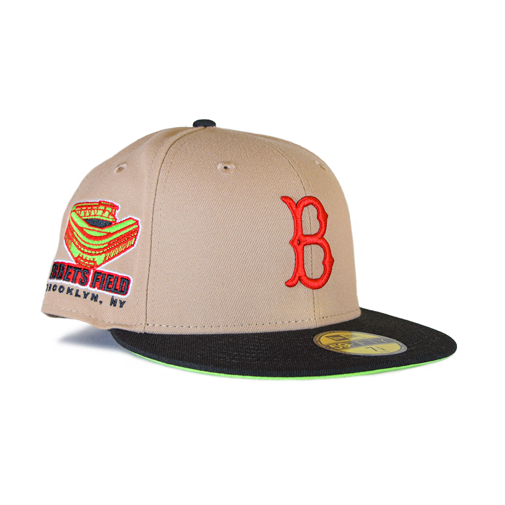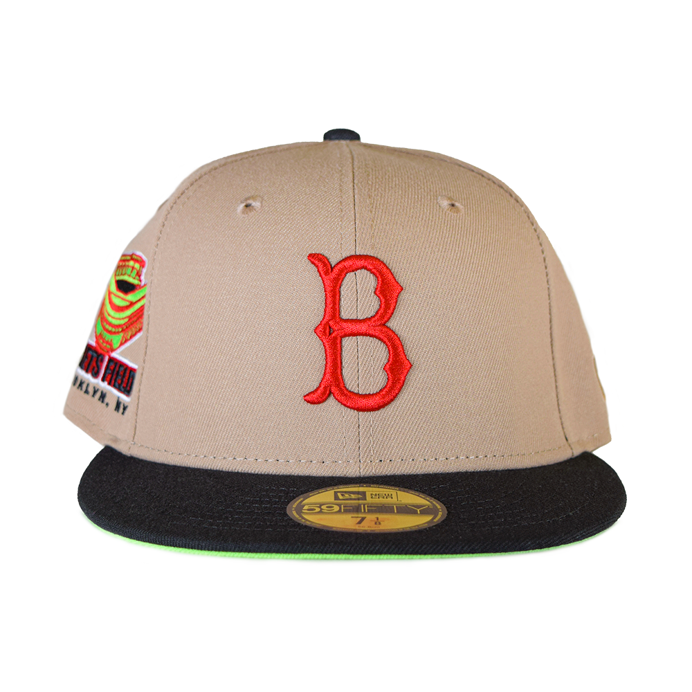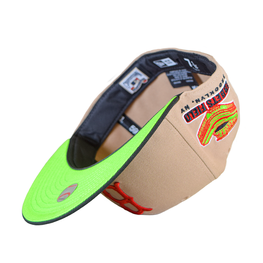 This Brooklyn Dodgers 'Antonio' fitted hat has a tan six panel structured high crown and embroidered eyelets with a black fabric squatchee button. The fitted cap also has a black flat bill with a neon undervisor and black sweatband. The front panel features the Brooklyn Dodgers logo embroidery and a Ebbets Field side patch embroidery on the right panel. The left panel of the fitted displays the New Era logo and the official MLB Batterman logo embroidery on the rear crown.