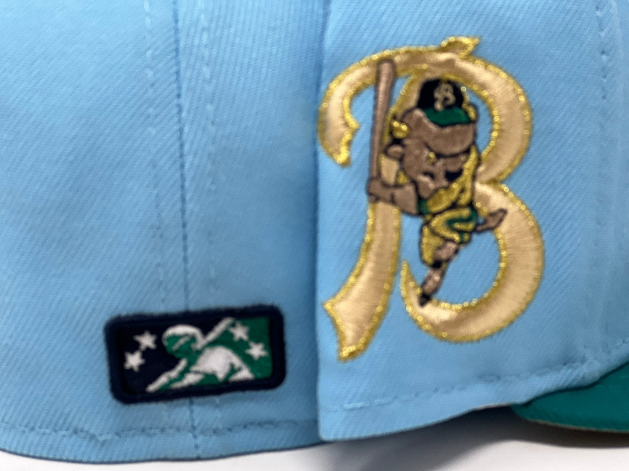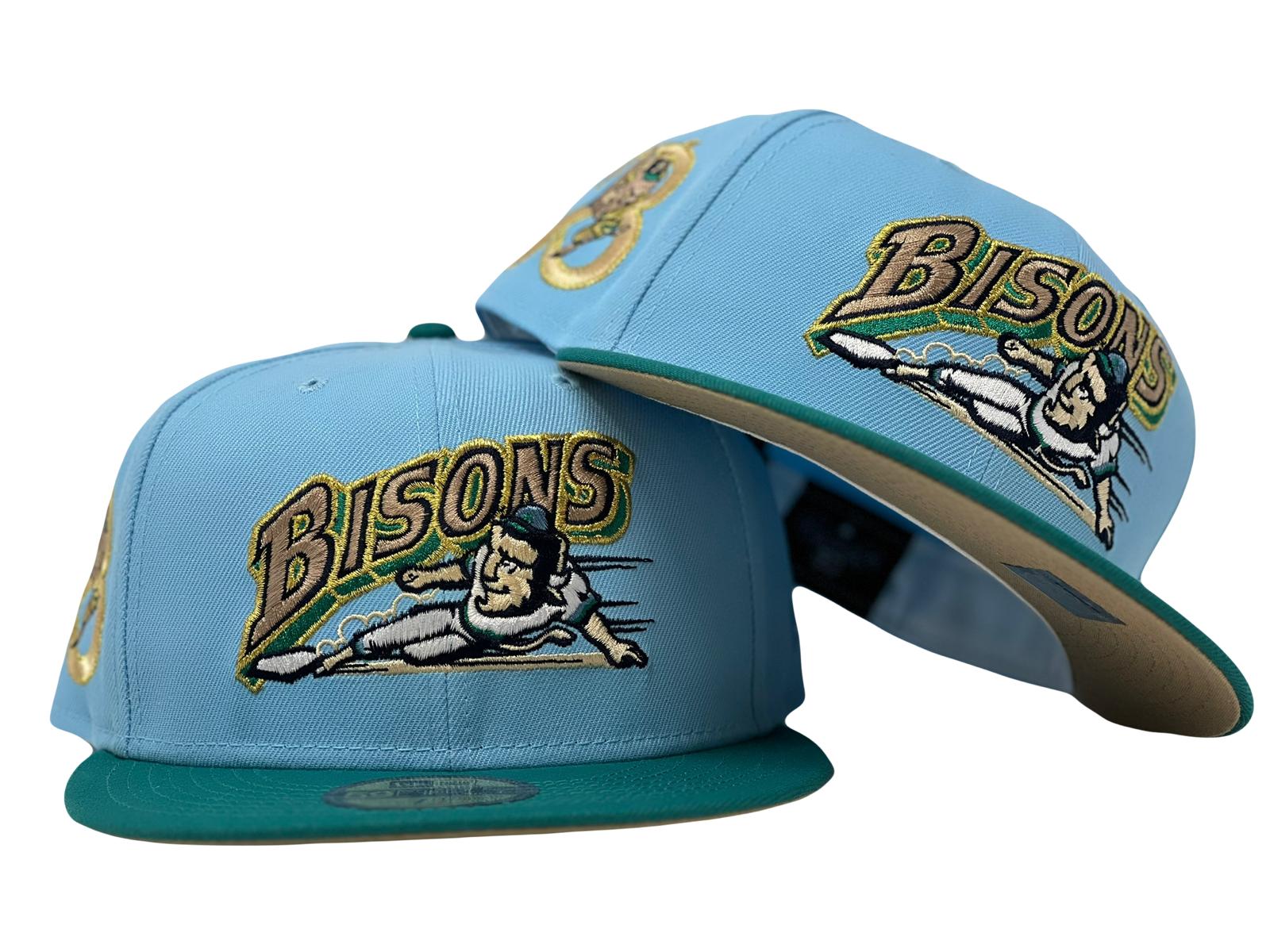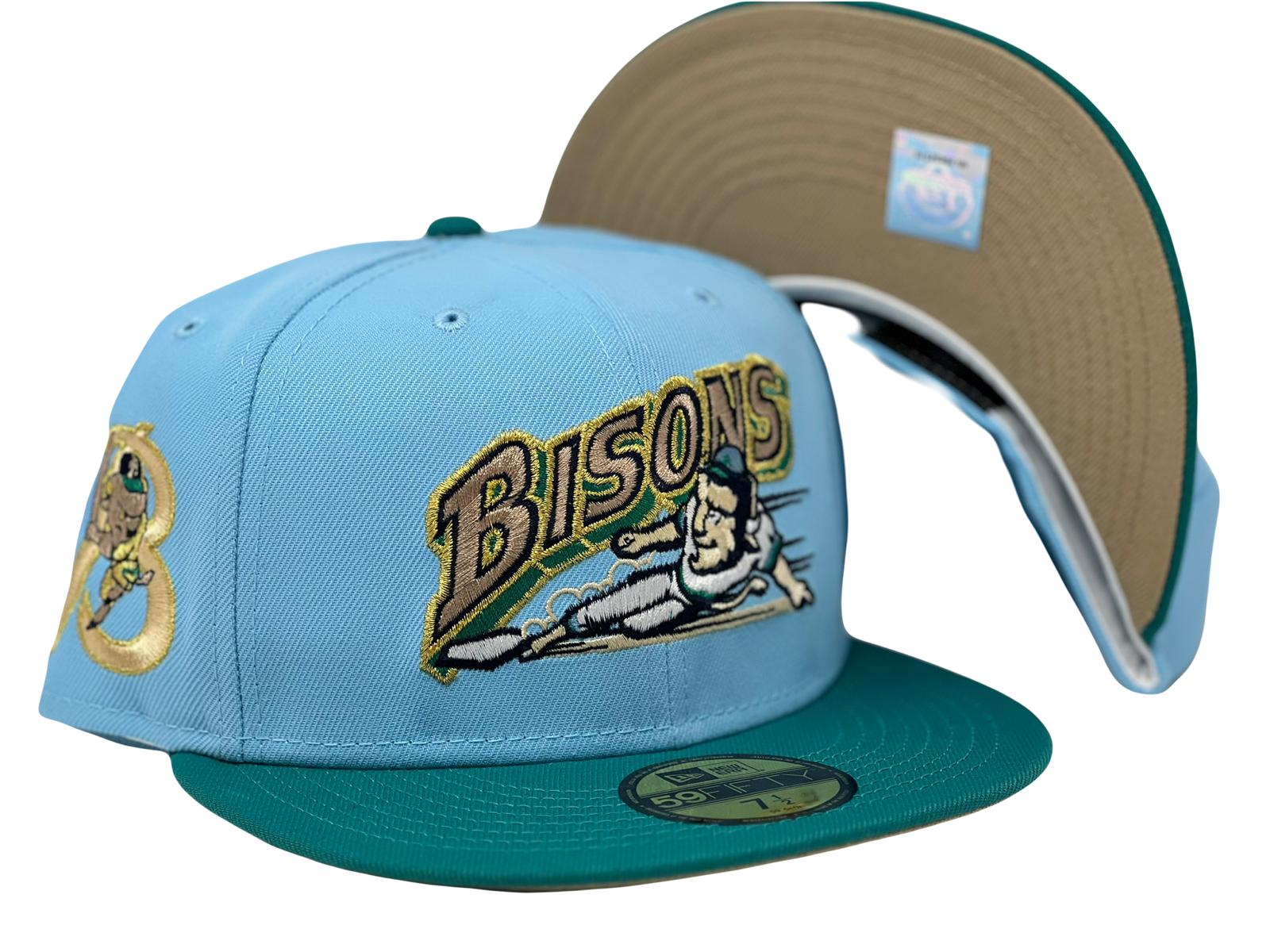 This New Era Buffalo Bison fitted hat was released by Sports World 165. The fitted has a Doscientos blue six panel structured high crown and embroidered eyelets with a Northwest green fabric squatchee button and flat bill. The fitted has a coffee brown undervisor and white sweatband. The front panel features the Buffalo Bison logo embroidery and a side patch embroidery on the right panel. The left panel of the fitted displays the New Era logo and the official MiLB logo embroidery on the rear crown.