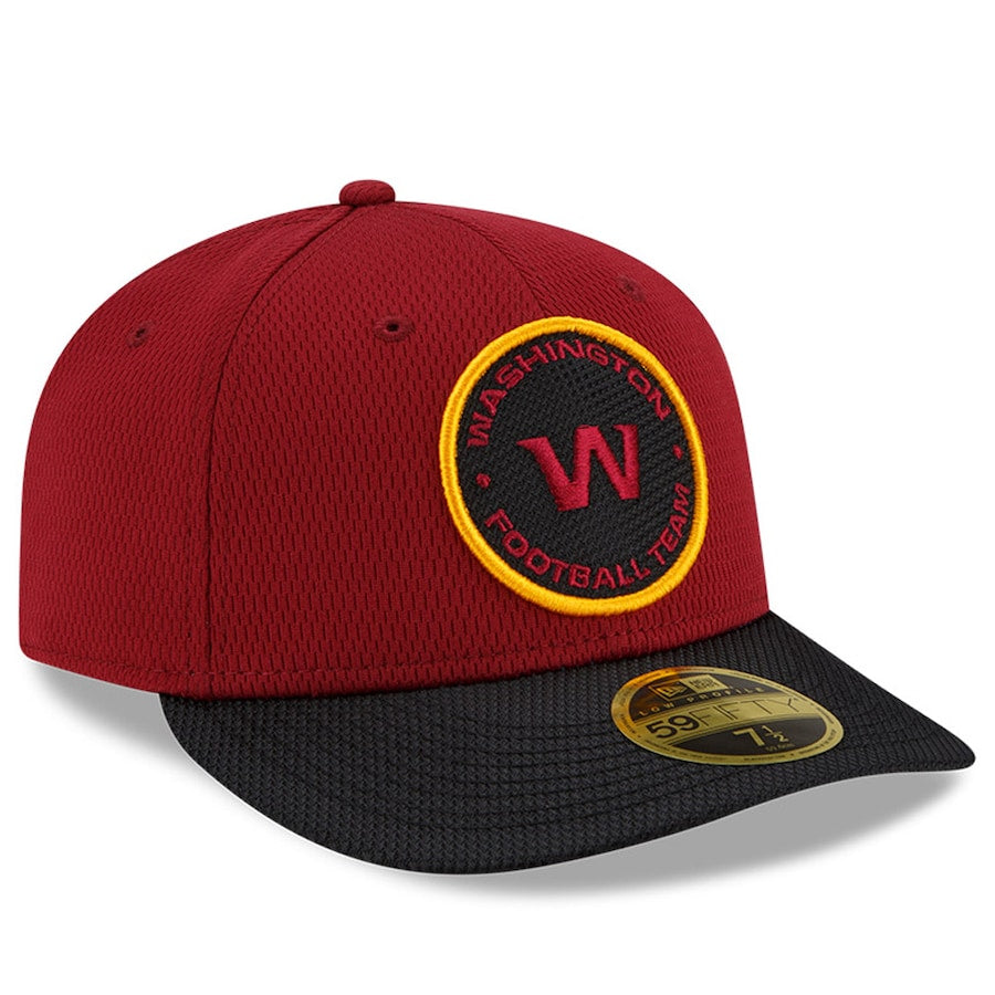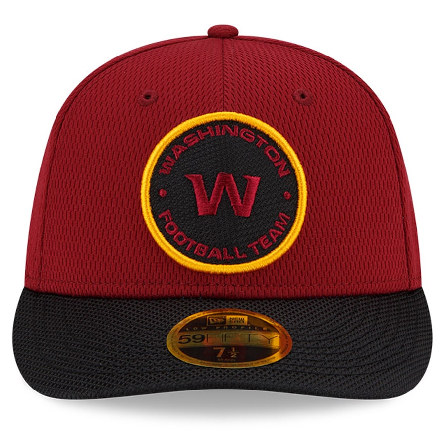 Refresh your Washington Football Team gear with this 2021 NFL Sideline Road Low Profile 59FIFTY Fitted Hat. This New Era two-tone cap is constructed of team color Dashmark fabric on the crown and black Dashmark fabric on the visor. The front crown features a bold Washington Football Team fabric applique logo with contrasting color embroidery. Look for your favorite Washington Football Team players and coaches wearing this cap on-field throughout the season!