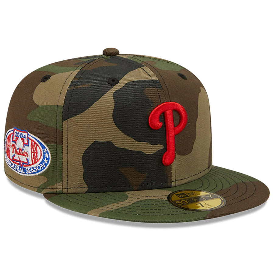 Showcase the history of the Philadelphia Phillies with this Citizens Bank Park Inaugural Season Patch Woodland Undervisor 59FIFTY Fitted Hat from New Era. It features a sweet Philadelphia Phillies logo in raised embroidery on the front and a patch on the side commemorating a significant franchise moment. This sweet Philadelphia Phillies hat is certain to be a favorite in your collection.