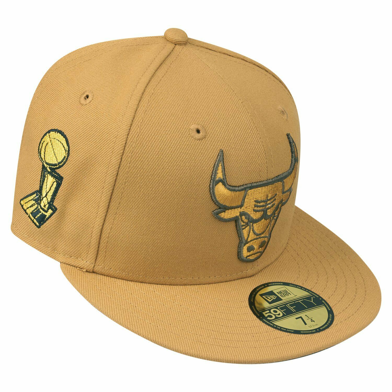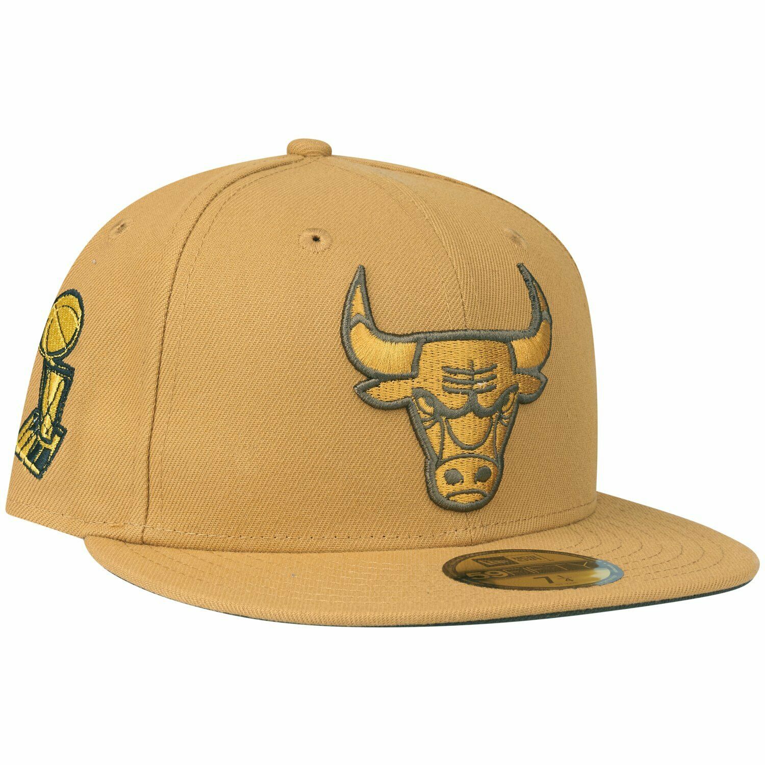 This New Era Chicago Bulls Championship Patch fitted hat has a Panama Tan colorway. The six panel structured high crown, embroidered eyelets and fabric squatchee button are Panama Tan. The flat bill of the fitted is also Panama tan with a black sweatband.