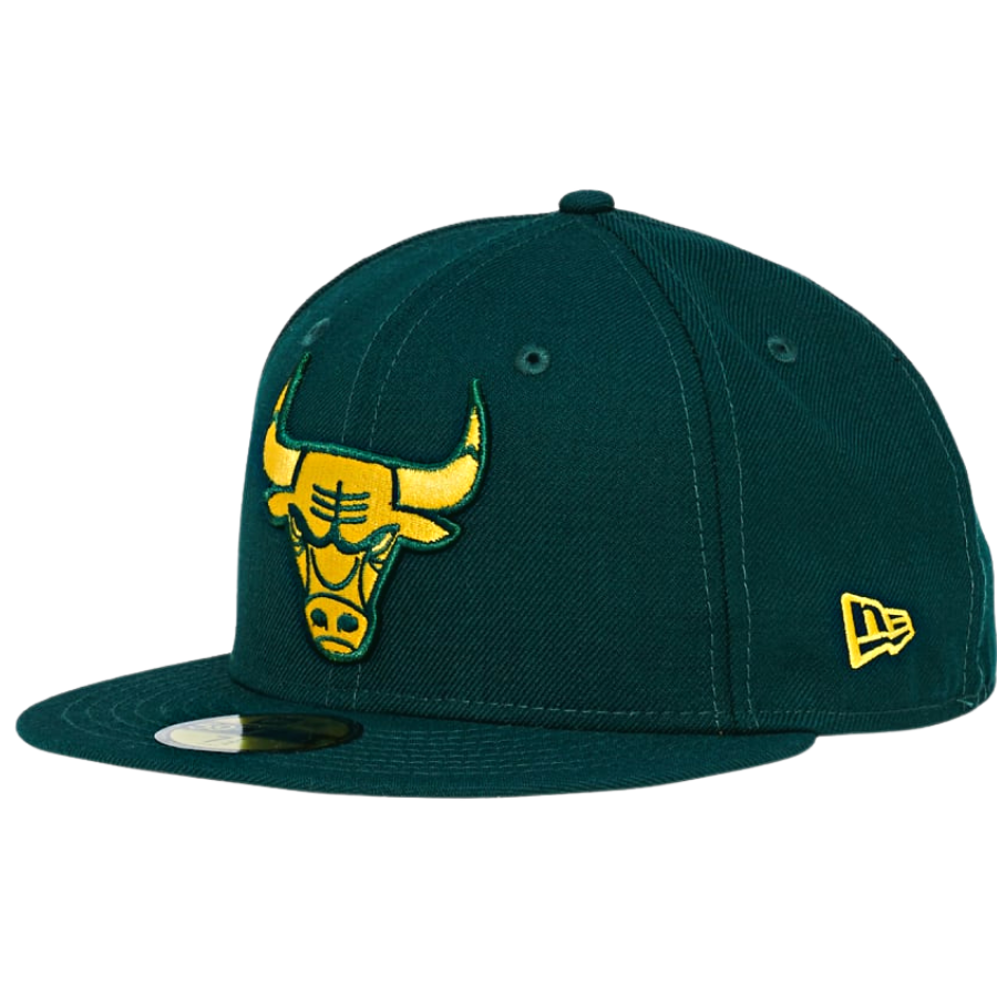 The New Era Chicago Bulls fitted hat has a dark green and yellow colorway. The 59FIFTY fitted has a dark green six panel structured high crown, embroidered eyelets and fabric squatchee button. The flat bill of the fitted is also dark green with a black undervisor and sweatband. The front panel features the Chicago Bulls logo embroidered in yellow thread as wells as the official NBA logo on the back of the crown.