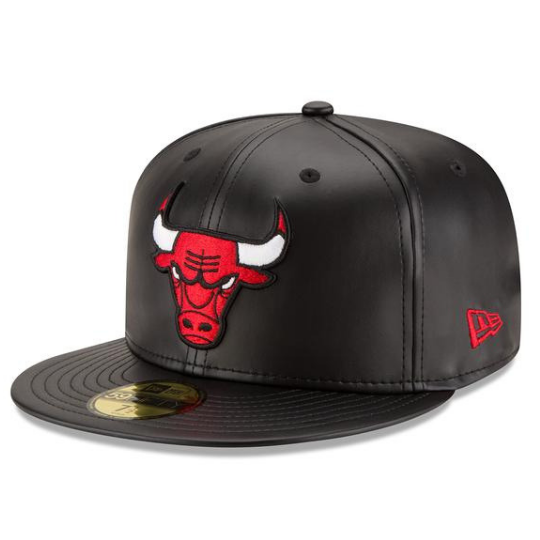 The New Era Chicago Bulls Faux Leather Fitted Hat is made almost entirely of faux leather. All 6-panels that make up the crown is made of black faux leather along with the squatchee button located at the top and brim of the fitted. The 6 embroidered eyelets are made of black thread. The left side of the New Era Chicago Bulls Faux Leather Fitted Hat displays the embroidery of the New Era "Fly Your Own Flag" logo in red thread. The back of the fitted displays the official NBA badge in white and red thread.
