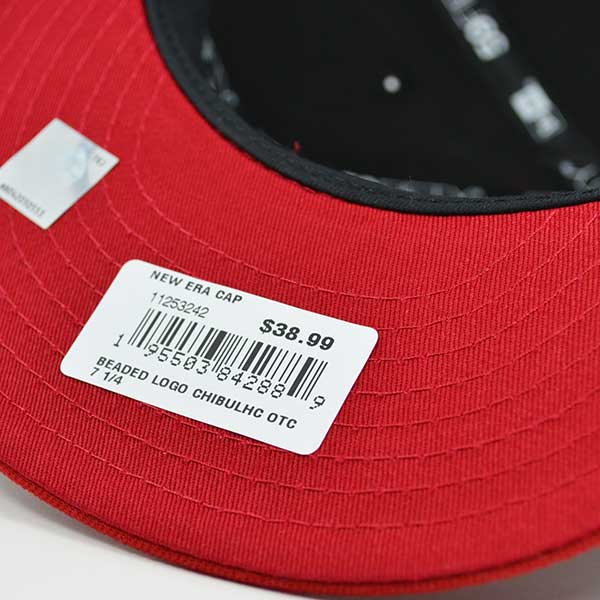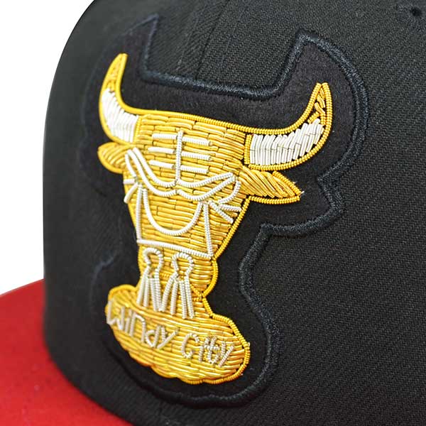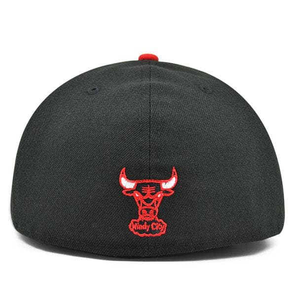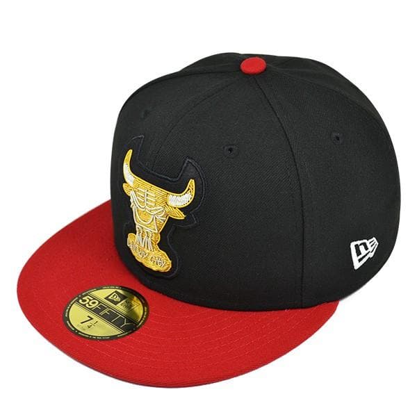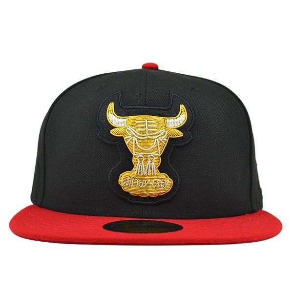 The New Era Chicago Bulls "Windy City" 59FIFTY Fitted Hat features a black, red and gold colorway. The high crown is black, flat bill is red and the front logo has gold and white colored beads.
