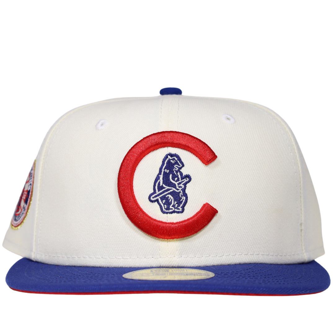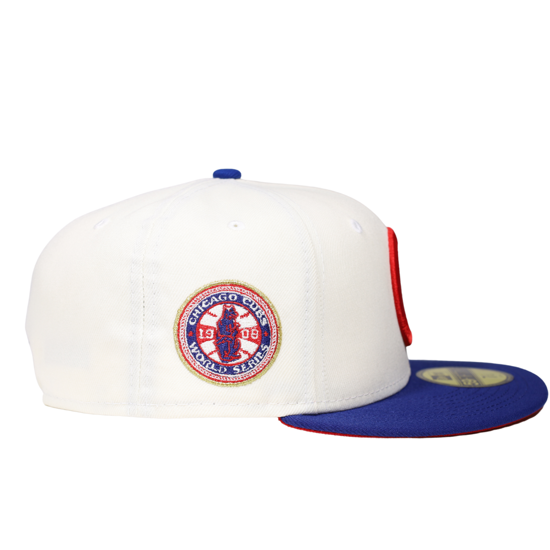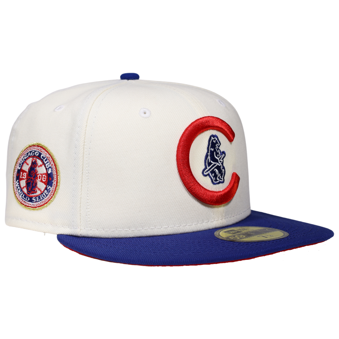 This New Era Chicago Cubs 1908 World Series 59FIFTY Fitted Hat has a six panel structured high crown and embroidered eyelets with a fabric squatchee button. The fitted cap has a flat bill with a sweatband. The front panel features the Chicago Cubs logo embroidery.