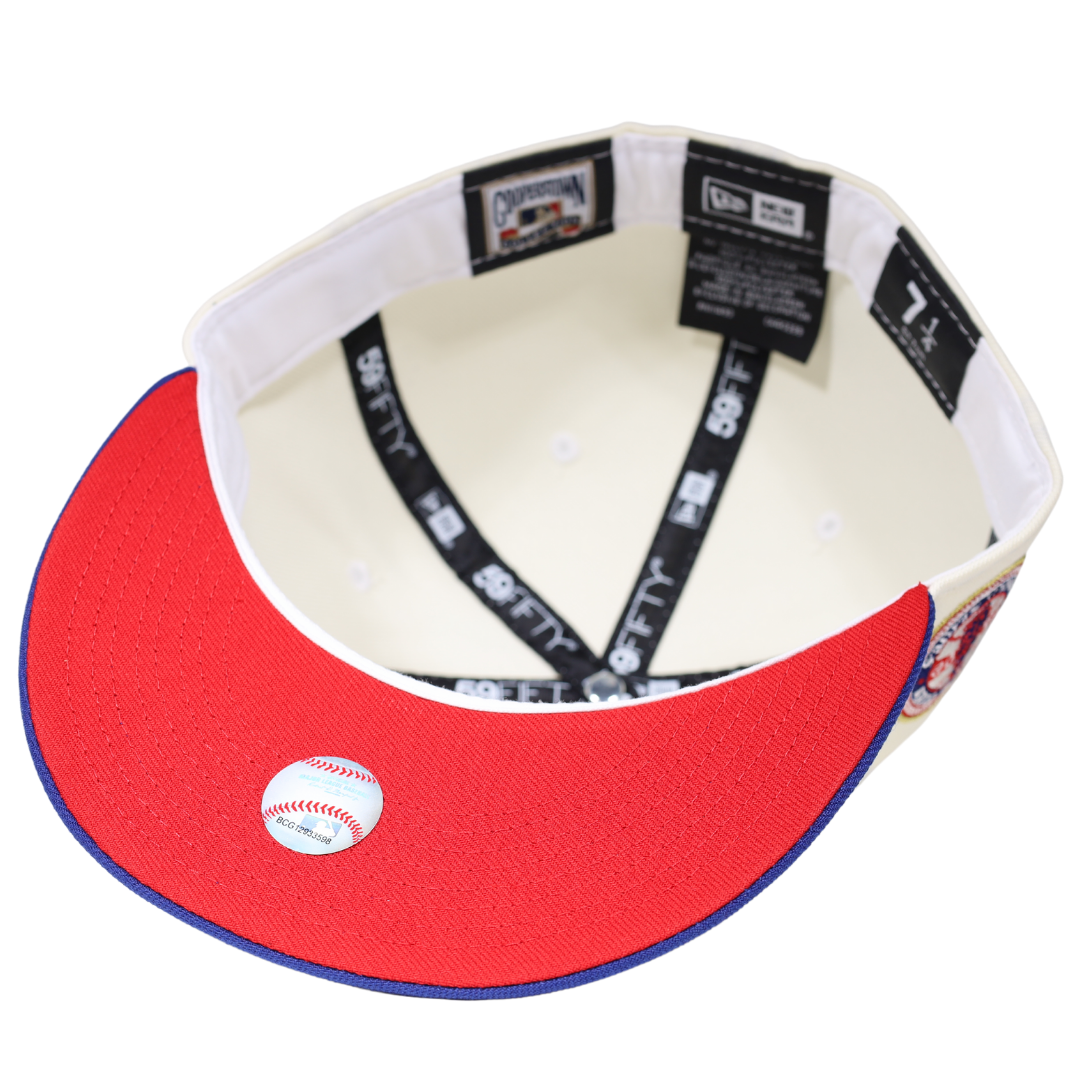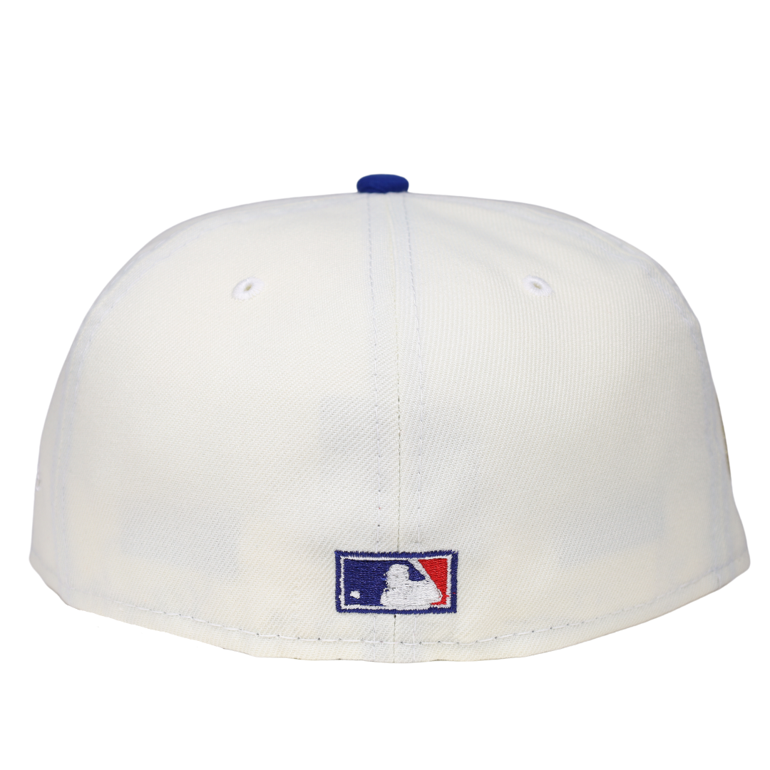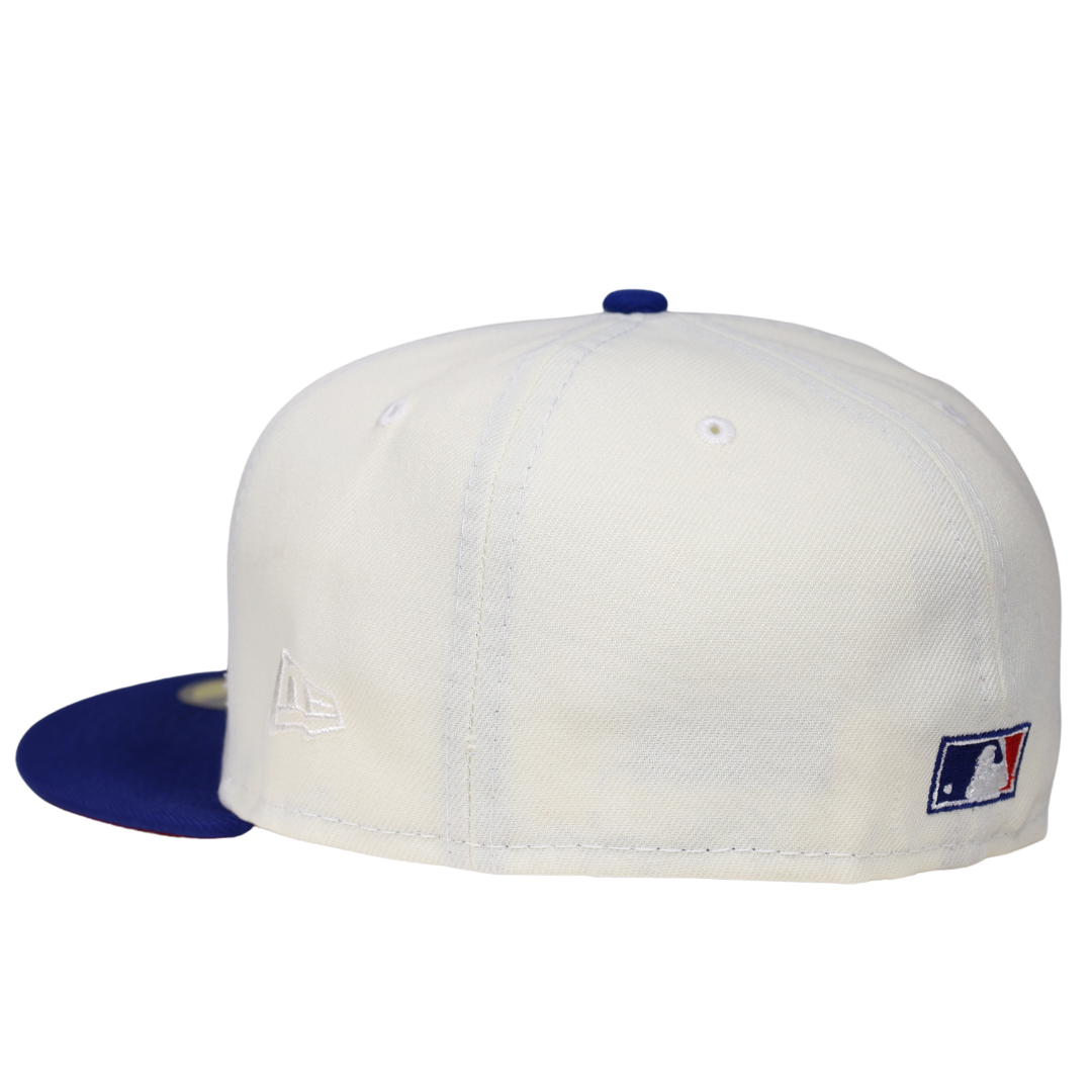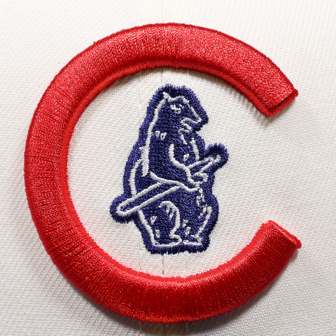 This New Era Chicago Cubs 1908 World Series 59FIFTY Fitted Hat has a six panel structured high crown and embroidered eyelets with a fabric squatchee button. The fitted cap has a flat bill with a sweatband. The front panel features the Chicago Cubs logo embroidery.