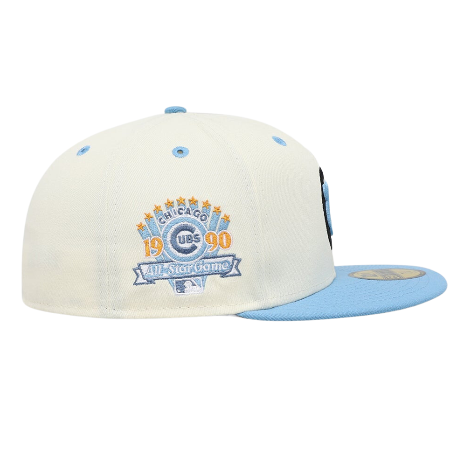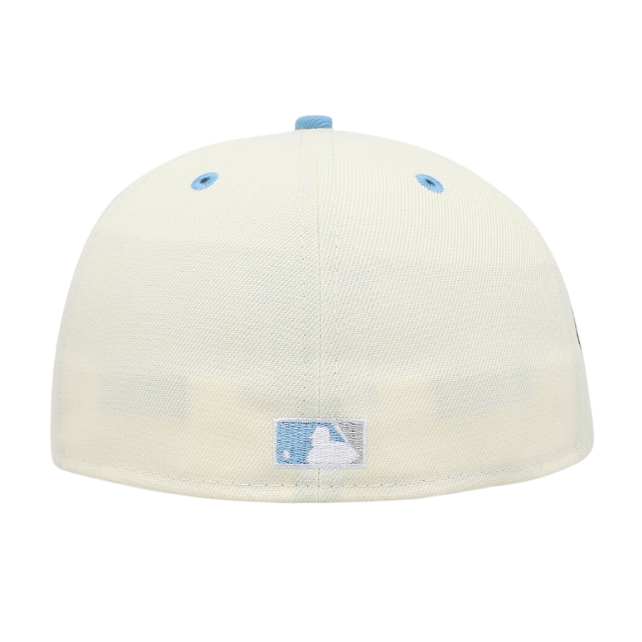 This New Era Chicago Cubs 'Chrome University Blue' 59FIFTY Fitted White was released by Culture Kings. The fitted has a chrome/white six panel structured high crown, university blue embroidered eyelets & fabric squatchee button. The flat bill of the fitted cap is also university blue with a grey bottom undervisor and a white sweatband. The front panel features the Chicago Cubs logo embroidery with a side patch on the right panel. The left panel of the fitted displays the New Era logo and the official MLB Batterman logo on the rear-crown .