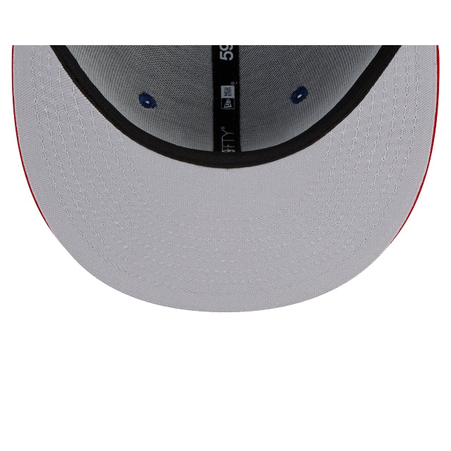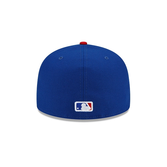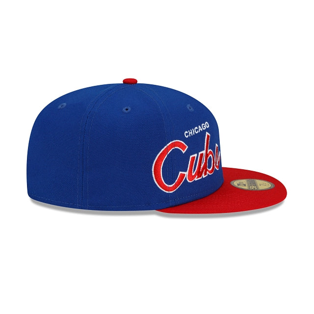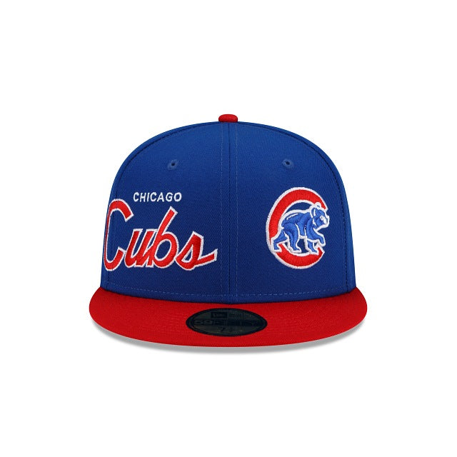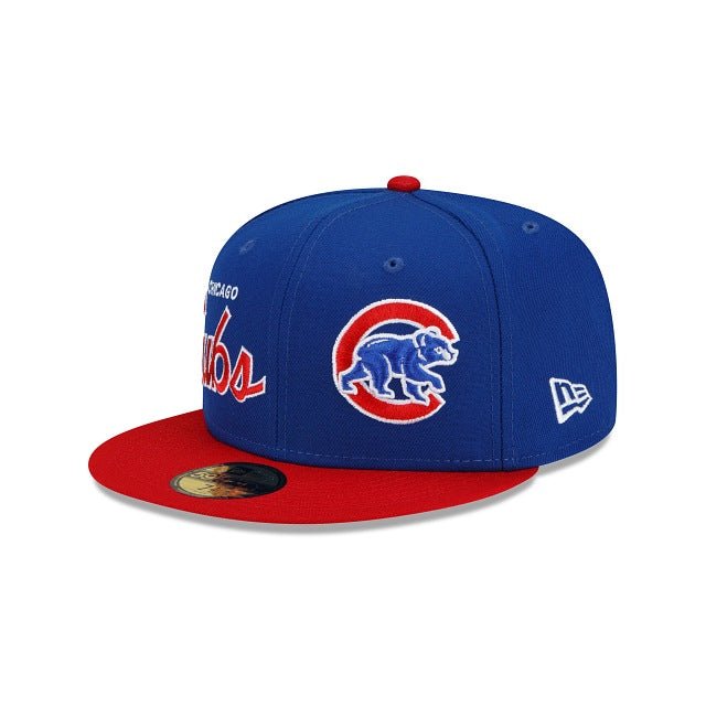 The Chicago Cubs Double Logo 59FIFTY Fitted Cap features a two tone team fabrication with an embroidered Cubs logo at the front left-wear panel, complimented by a team script at the right-wear side and a matching MLB Batterman logo at the rear.