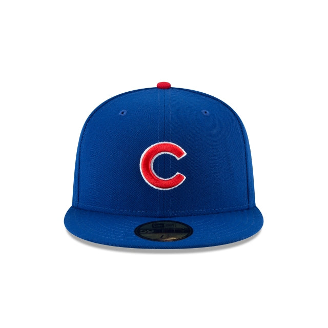 The Chicago Cubs Jackie Robinson Day 59FIFTY Fitted Cap features an embroidered Cubs logo at the front panels, a Jackie Robinson Day patch at the right-wear side, and an MLB Batterman logo at the rear.
