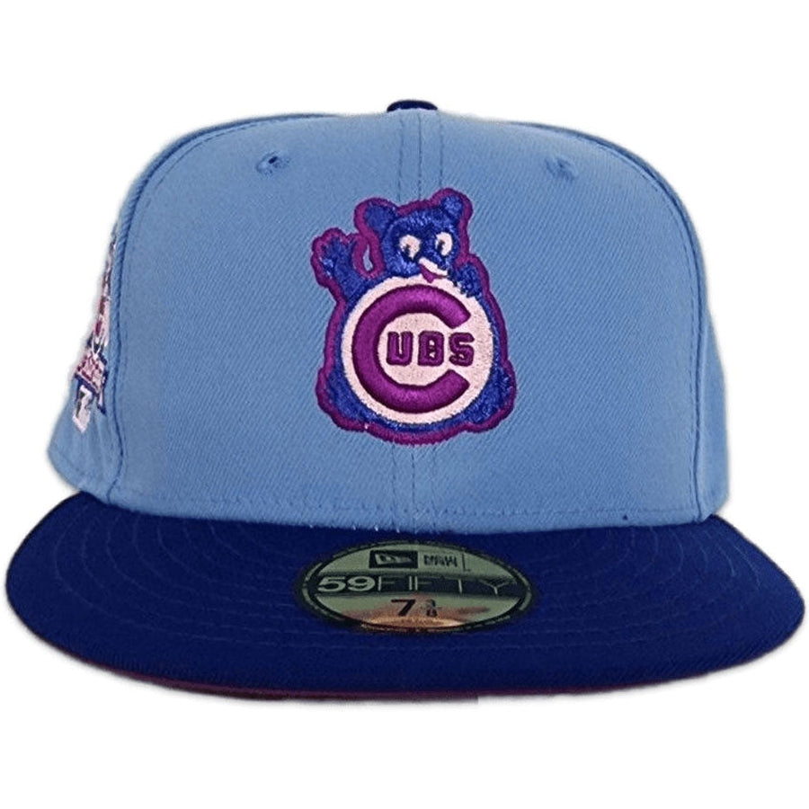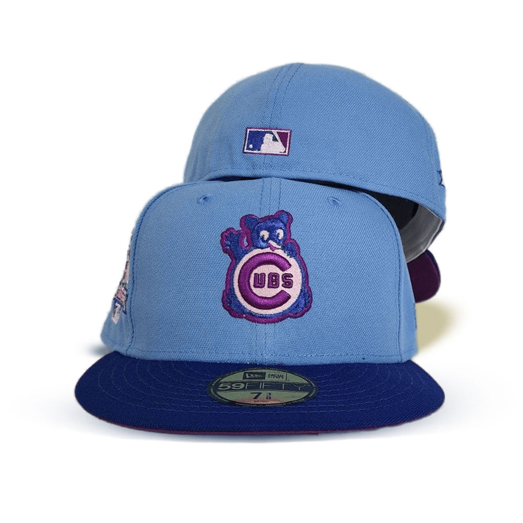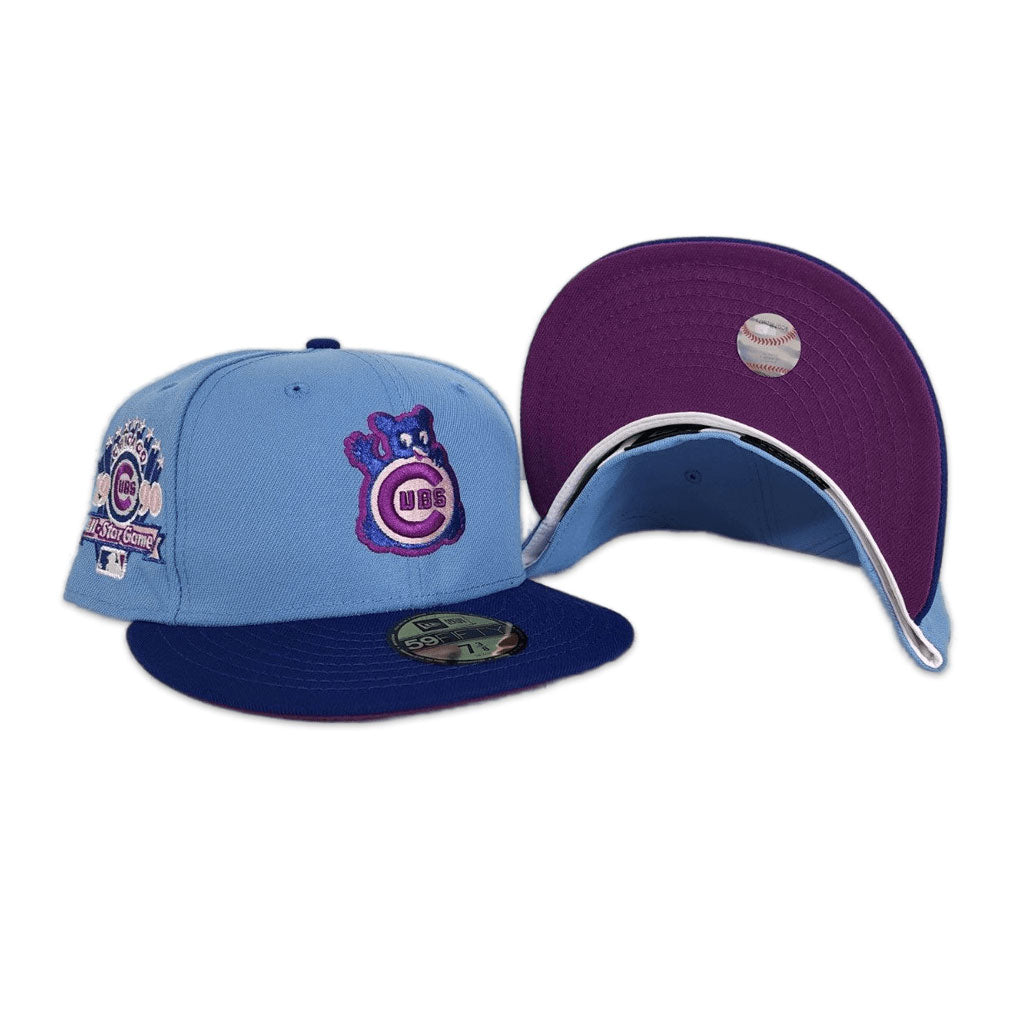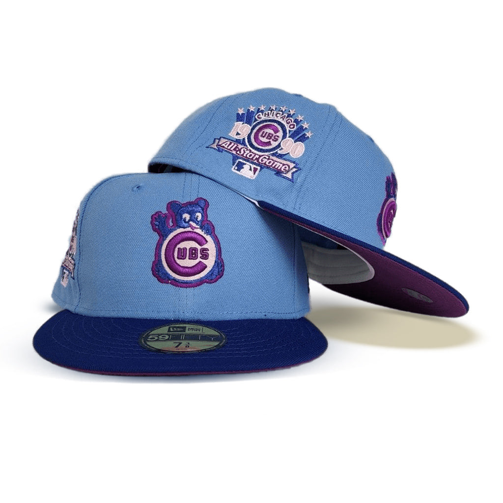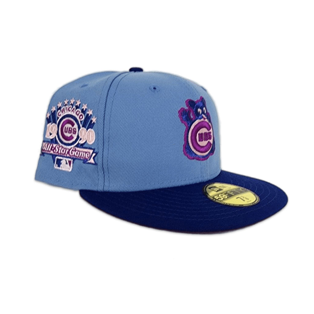This New Era Chicago Cubs Sky Blue/Royal 1990 All-Star Game 59FIFTY Fitted Hat has a sky blue six panel structured high crown and embroidered eyelets with a sky blue fabric squatchee button. The fitted cap has a royal blue flat bill with a _ undervisor and white sweatband. The front panel features the Chicago Cubs logo embroidery and a _ side patch embroidery on the right panel. The left panel of the fitted displays the New Era logo and the official MLB logo embroidery on the rear crown.