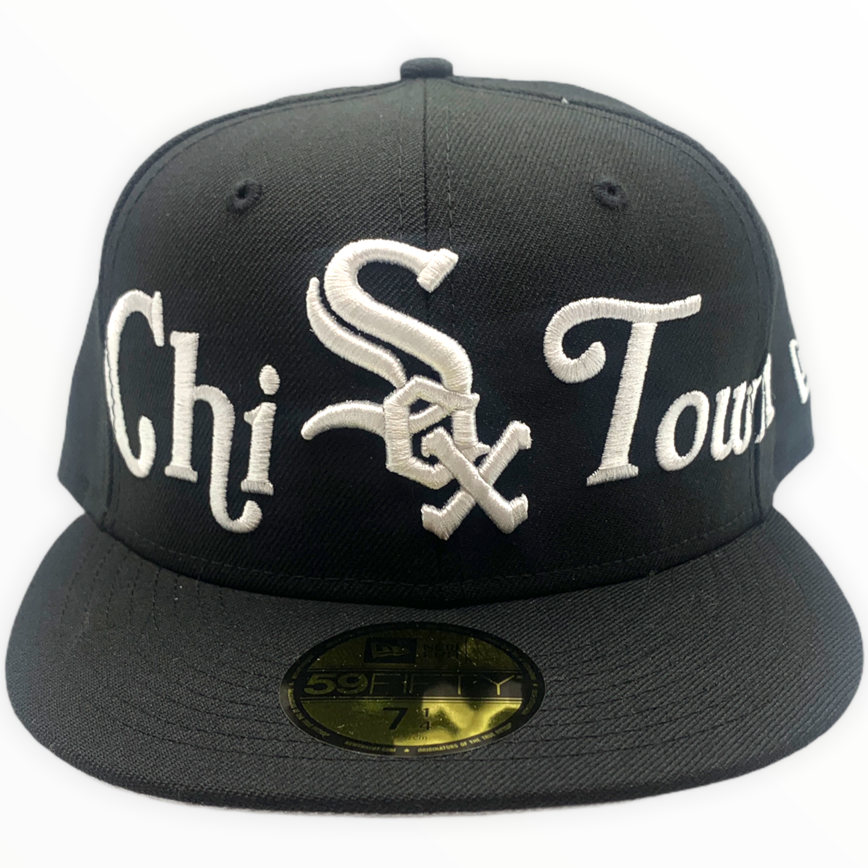 The New Era 59FIFTY Chicago White Sox "Chi Town" Fitted Hat has a black and white colorway. The structured six panel high crown of the fitted is black as well as the embroidered eyelets, fabric squatchee button and flat bill. The front panel features the MLB White Sox logo and the wordmark "Chi Town" embroidered in white thread.