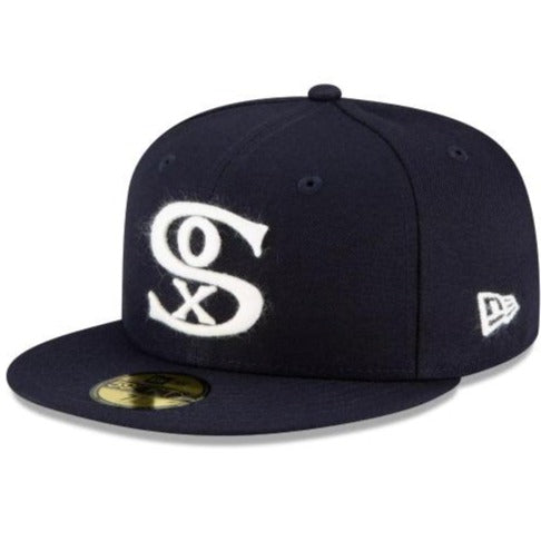 The Chicago White Sox Field of Dreams 59FIFTY Fitted Cap features a retro White Sox logo embroidered at the front panels with an MLB Batterman logo at the rear.