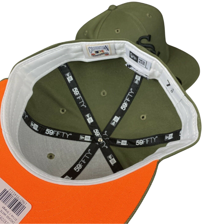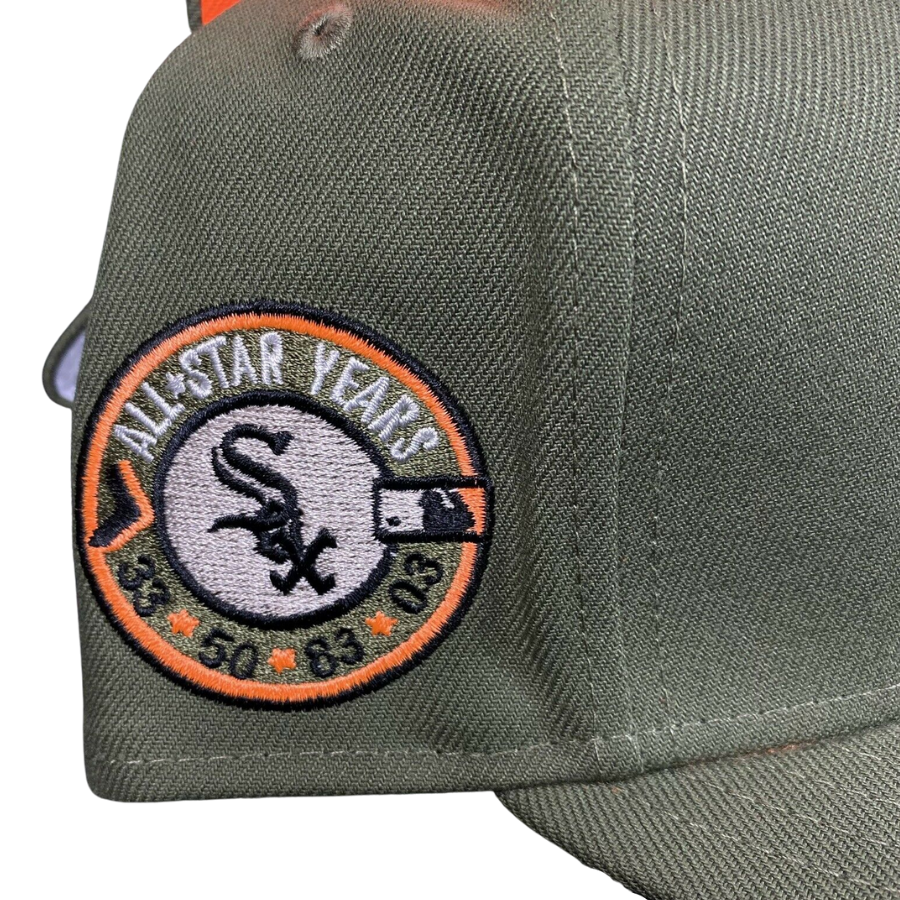 This New Era Chicago White Sox MLB All-Star Years fitted hat has a hunter green six panel structured high crown, embroidered eyelets and fabric squatchee button. The flat bill of the fitted cap is hunter green with an orange undervisor with a white sweatband. The front panel features the White Sox logo embroidered in black thread. The right panel features an All-Star Game side patch containing multiple years.