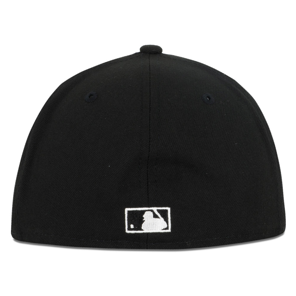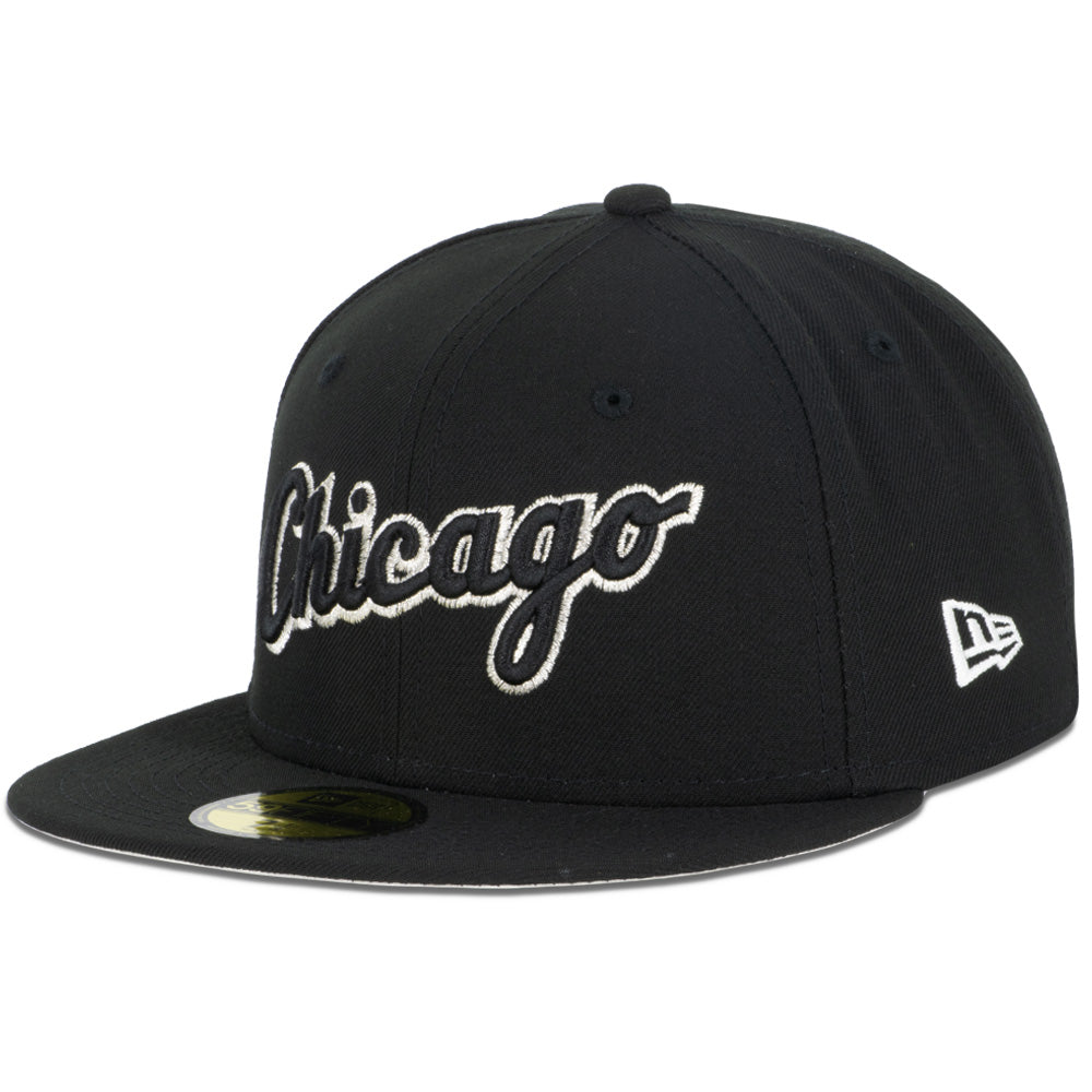 This New Era Chicago White Sox Moonshot 59FIFTY Fitted Hat was released by Just Sports. The fitted has a black six panel structured high crown and embroidered eyelets with a black fabric squatchee button. The fitted cap also has a black flat bill with a cream undervisor and white sweatband. The front panel features the Chicago White Sox logo embroidery and a side patch embroidery on the right panel. The left panel of the fitted displays the New Era logo and the official MLB Batterman logo embroidery on the rear crown.