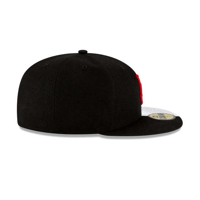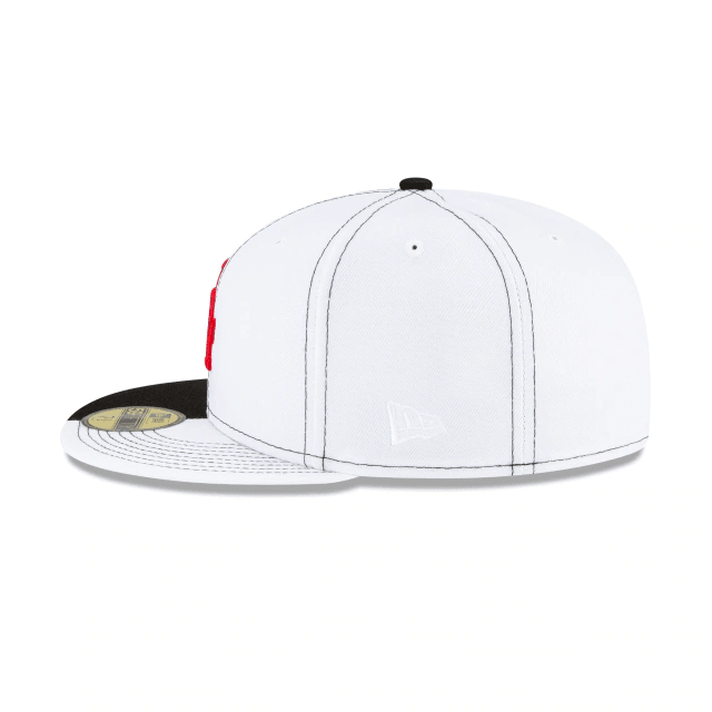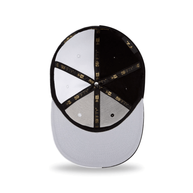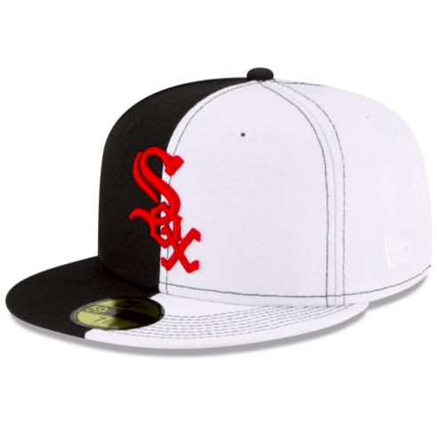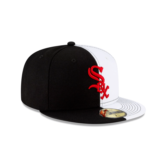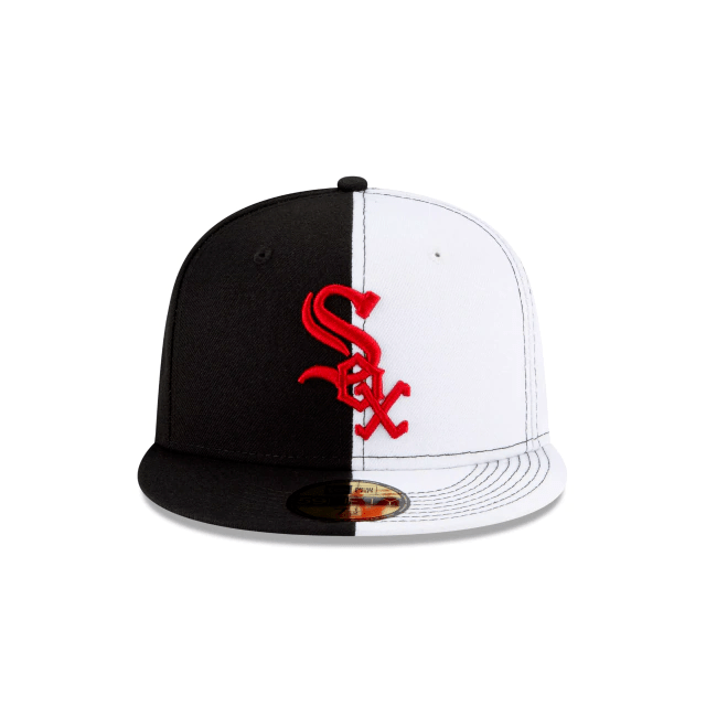 The official name given to this style fitted hat by New Era Cap Company is "Split Crown". We however, refer to this style as the Scarface Theme fitted hat because of the color scheme and how the colors are presented. The Chicago White Sox Scarface Theme 59Fifty fitted hat is half black on the right side of the hat and half white on the left side of the hat. The squatchee button located at the top is black. The over brim is half black and half white while the under brim is entirely white. The front panel displays the MLB team logo embroidered in a red letter. The back of the hat displays the official MLB batterman logo and the left side is the embroidery of the iconic New Era flag in white threads. The "59Fifty" wording of the interior taping and sweatband of the hat are in gold accents.