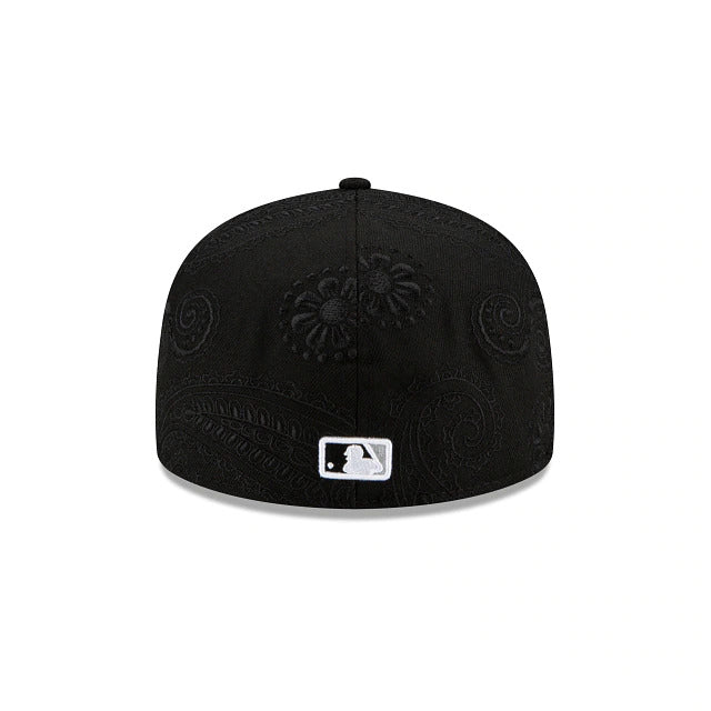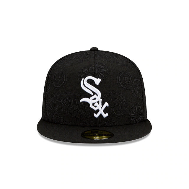 Enter the vortex with the Chicago White SoxSwirl 59FIFTY Fitted Cap featuring a tonal paisley embroidery throughout the crown with the teams logo embroidered at the front panels with a MLB Batterman logo at the rear and a gray undervisor.