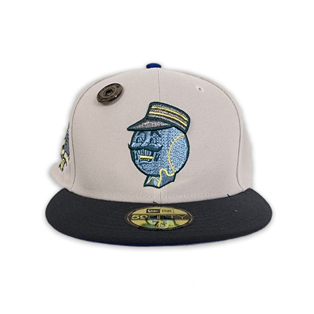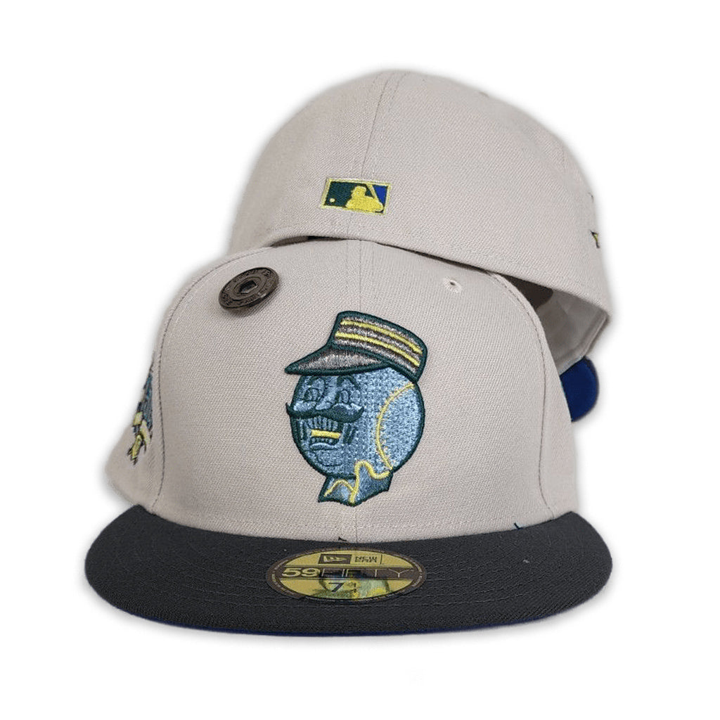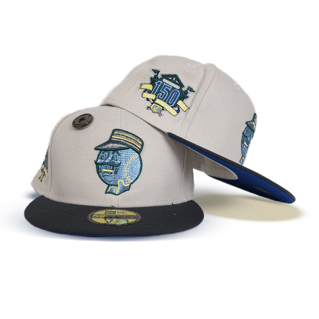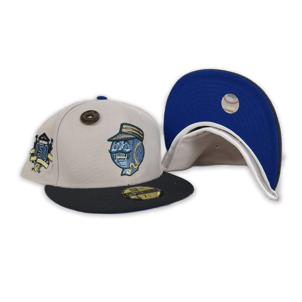This New Era Cincinnati Reds 150th Anniversary Stone/Royal Blue UV 59FIFTY Fitted Hat has a stone six panel structured high crown and embroidered eyelets with a royal blue fabric squatchee button. The fitted cap has a graphite flat bill with a royal blue undervisor. The front panel features the Cincinnati Reds logo embroidery and a 150th Anniversary side patch embroidery on the right panel. The left panel of the fitted displays the New Era logo and the official MLB logo embroidery on the rear crown.