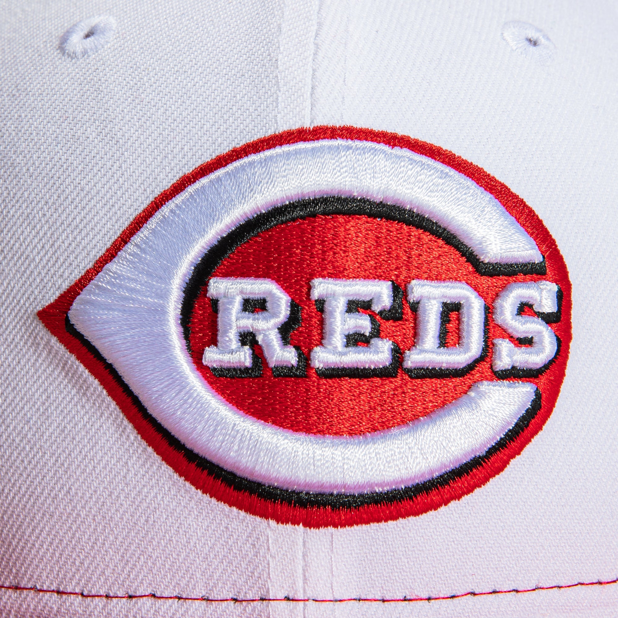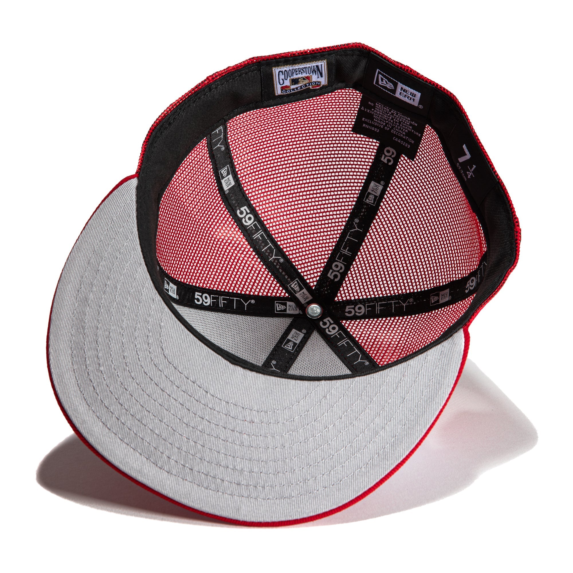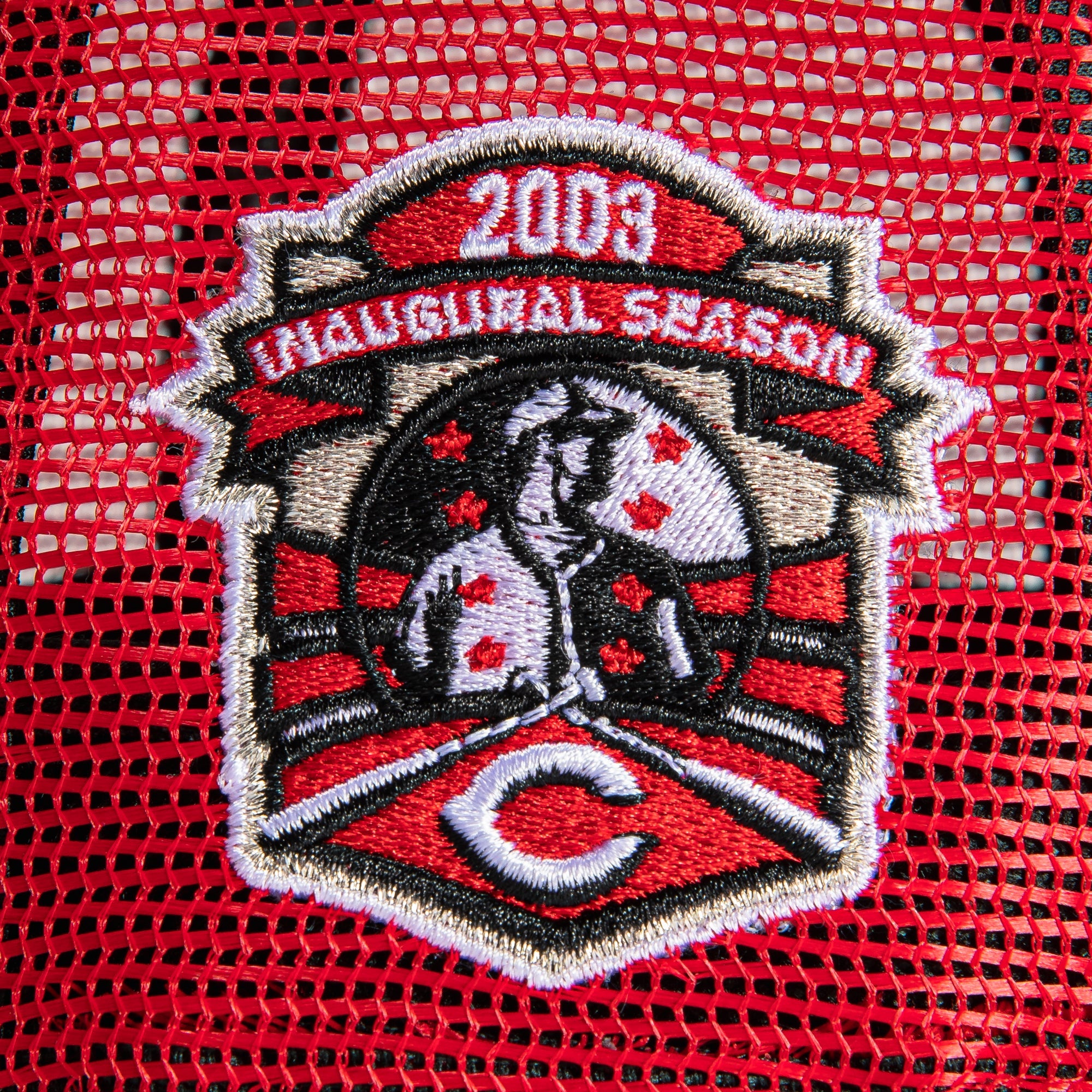 This New Era Cincinnati Reds 2003 Inaugural Trucker Rail 2022 59FIFTY Fitted Hat is a Hat Club exclusive. The fitte has a split white and red six panel structured high crown and embroidered eyelets with a red fabric squatchee button. The fitted cap also has a red flat bill with a grey undervisor. The front panel features the Cincinnati Reds logo embroidery and a 2003 Inaugural Season side patch embroidery on the right panel. The left panel of the fitted displays the New Era logo and the official MLB logo embroidery on the rear crown.