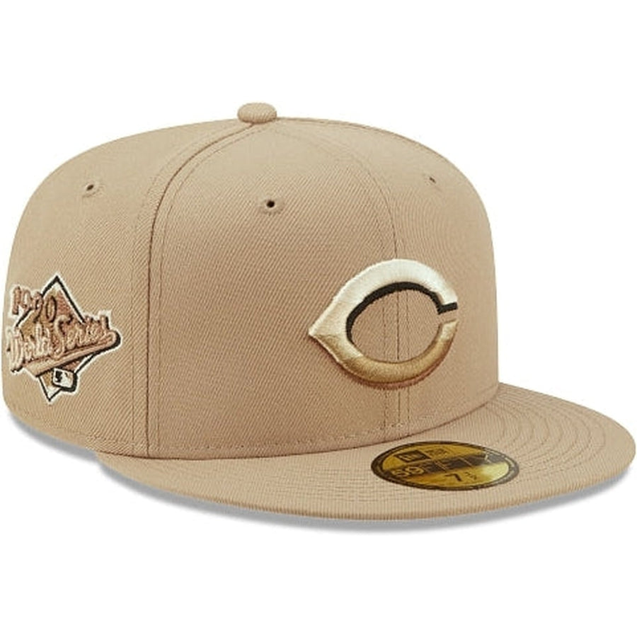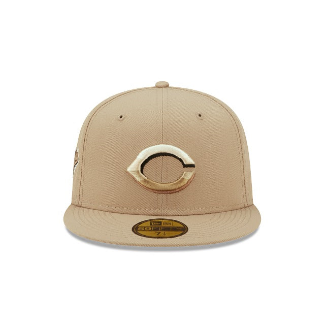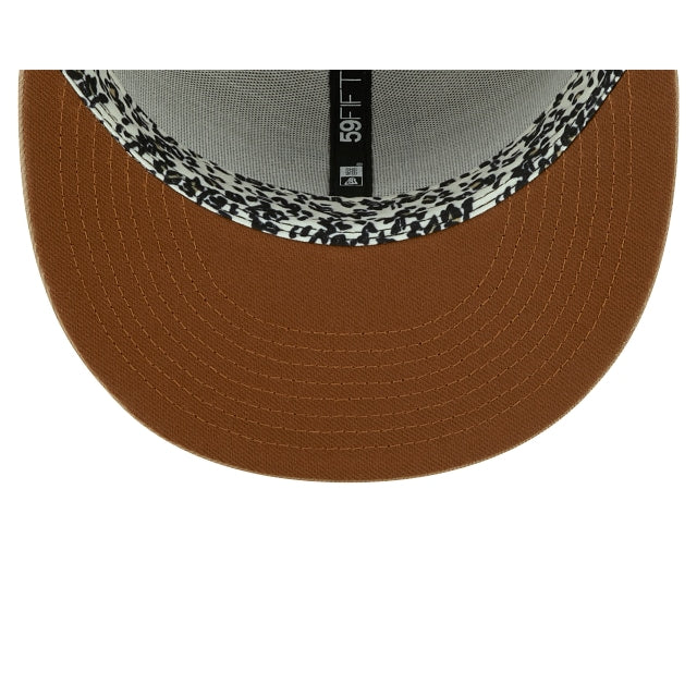 The Cincinnati Reds Leopard 59FIFTY Fitted Cap features an embroidered Reds multi-colored logo at the front panels, a 1990 World Series patch at the right-wear side, and a matching MLB Batterman logo at the rear. Additional details include a leopard inspired inner sweatband and brown undervisor.