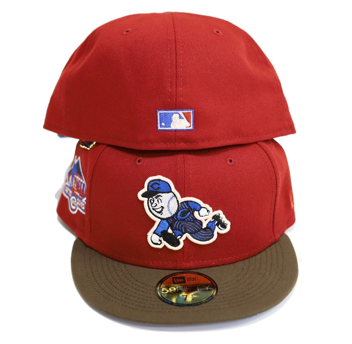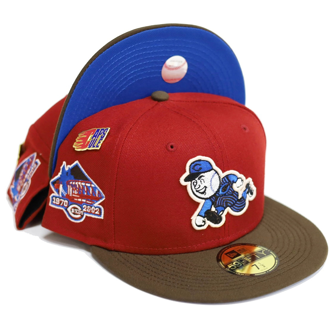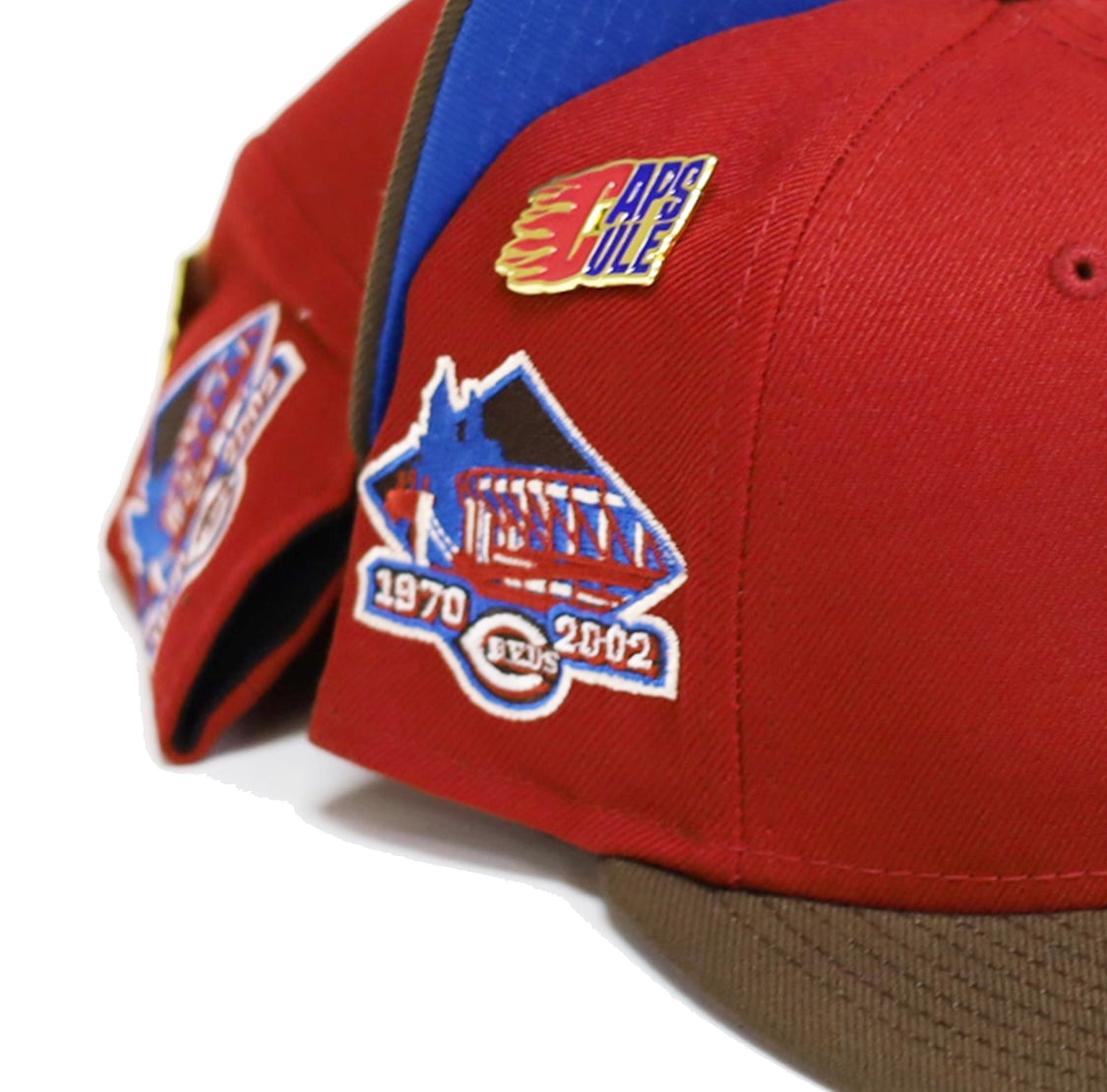 This New Era Cincinnati Reds Nitro 3.0 59FIFTY fitted hat is a Capsule Hats exclusive release. The fitted has a red six panel structured high crown and embroidered eyelets with a brown fabric squatchee button and flat bill. The undervisor of the fitted cap is royal blue with a black sweatband. The front panel features the Cincinnati Reds logo embroidered in brown, white and royal blue threads with a 1970 - 2002 side patch embroidered on the right panel in the same colorway.