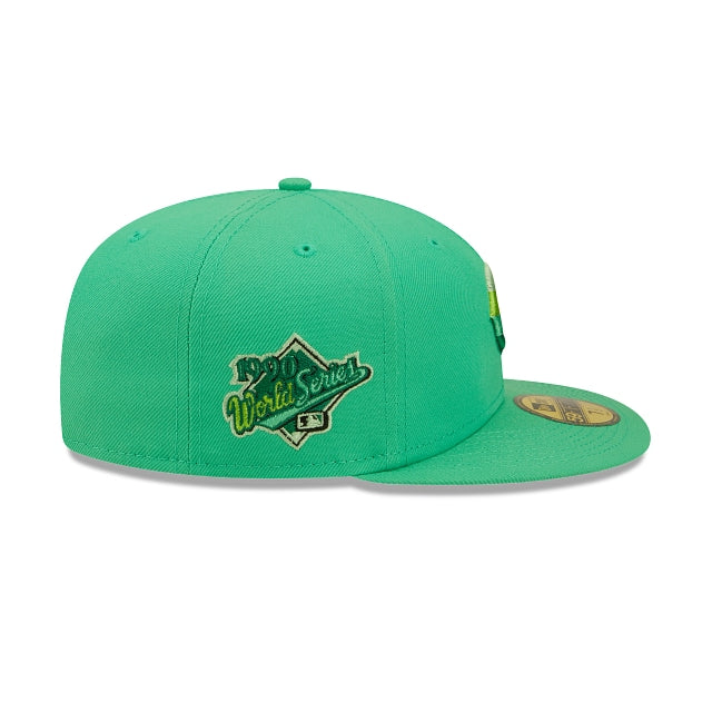 The Cincinnati Reds Snakeskin 59FIFTY Fitted Cap features an embroidered Reds multi-colored logo at the front panels, a 1990 World Series patch at the right-wear side, and a matching MLB Batterman logo at the rear. Additional details include a snakeskin inspired inner sweatband and green undervisor.