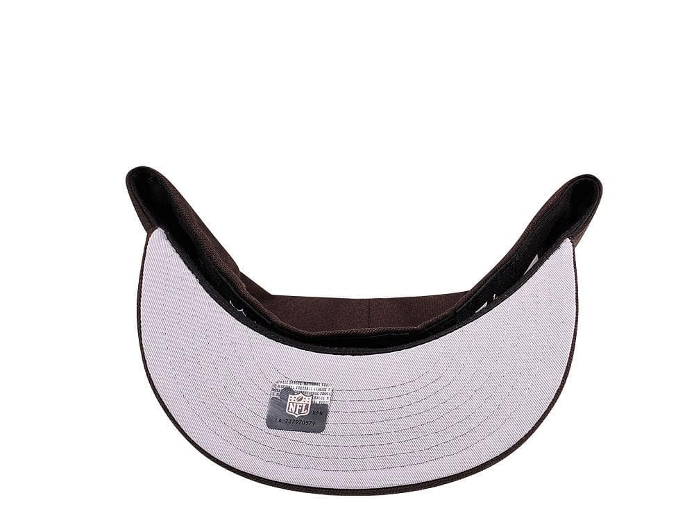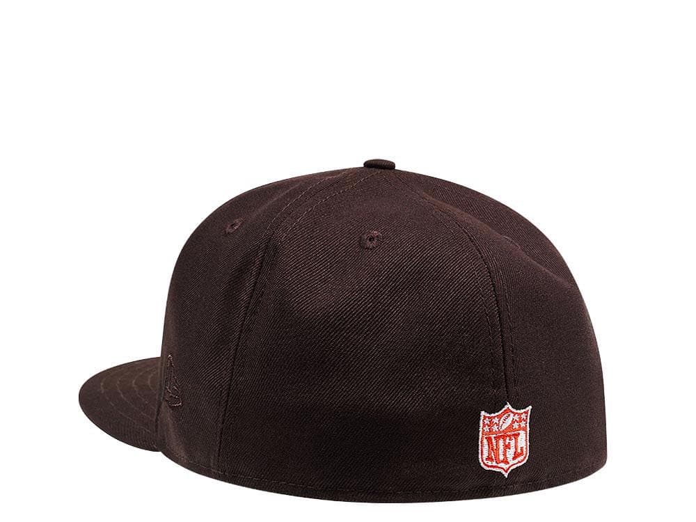 The New Era Cleveland Browns Skull Edition 59FIFTY fitted hat is a Topperz Store exclusive. The six panel structured high crown, embroidered eyelets and fabric squatchee button are brown. The flat bill of the fitted cap is brown with a grey bottom undervisor. The front panel features a Cleveland Browns skull head embroidery. The left panel features the New Era "Fly Your Own Flag" logo. The back of the crown features the official NFL shield embroidered in orange and white colorway.