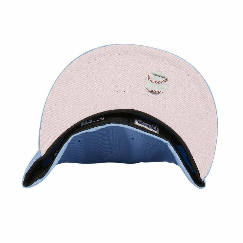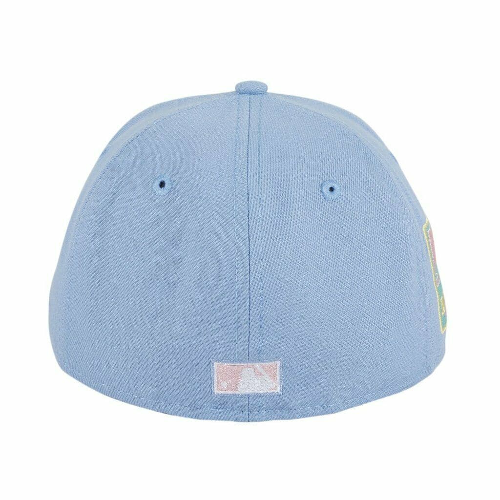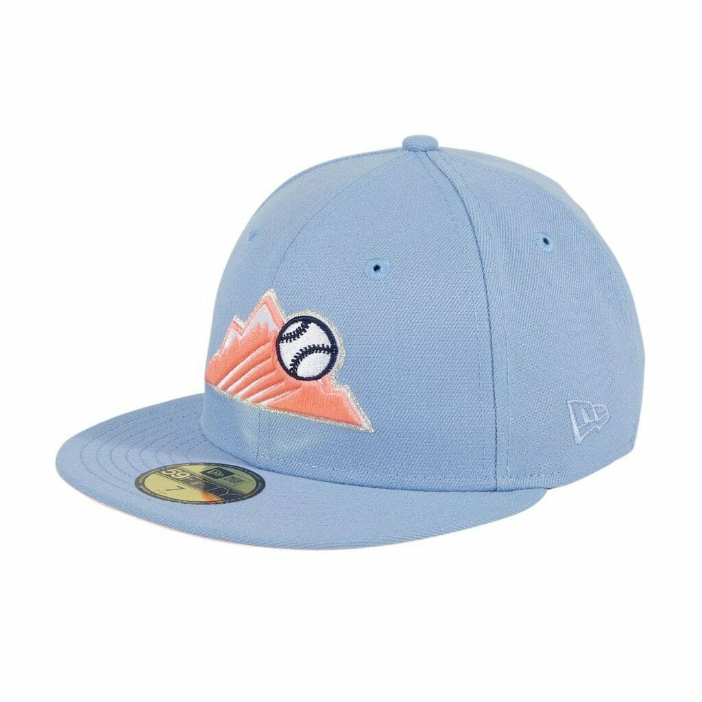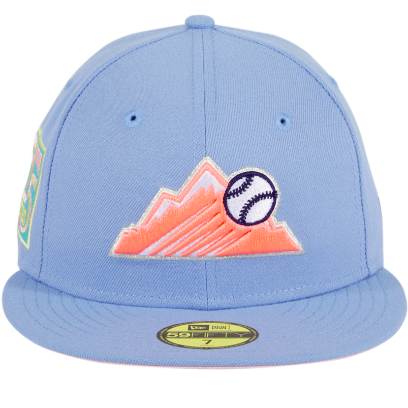 The New Era Colorado Rockies fitted hat has a cotton candy colorway. The 6 panel structured, high crown is baby blue as well as the embroidered eyelets, fabric squatchee button and flat brim with a pink bottom undervisor. The front displays the Colorado Rockies logo in baby pink & white thread. The New Era logo on the left panel is embroidered in baby blue thread with a cotton candy side patch on the right panel of the hat. The official MLB batterman logo on the back of the fitted is embroidered in white & baby pink thread. This is a Hat Club exclusive fitted hat.