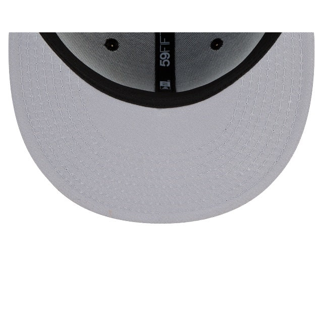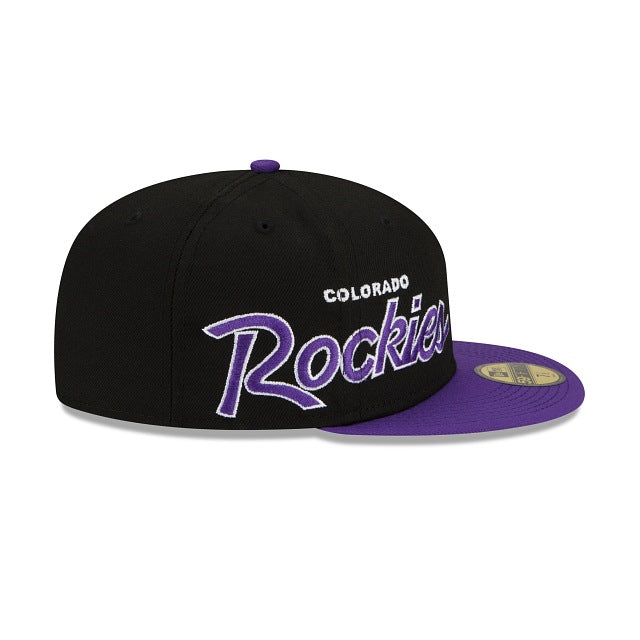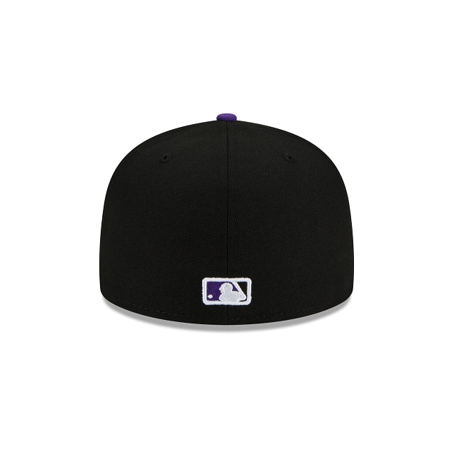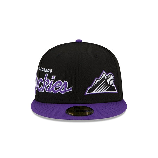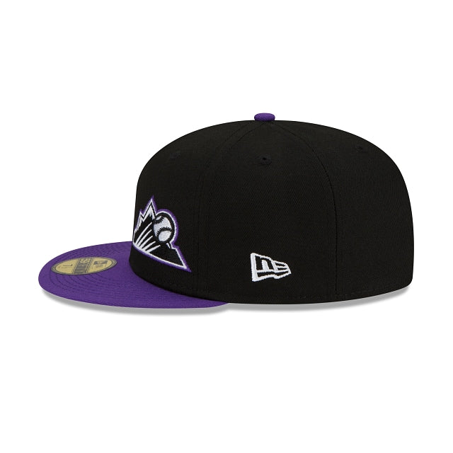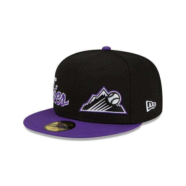 The Colorado Rockies Double Logo 59FIFTY Fitted Cap features a two tone team fabrication with an embroidered Rockies logo at the front left-wear panel, complimented by a team script at the right-wear side and a matching MLB Batterman logo at the rear.