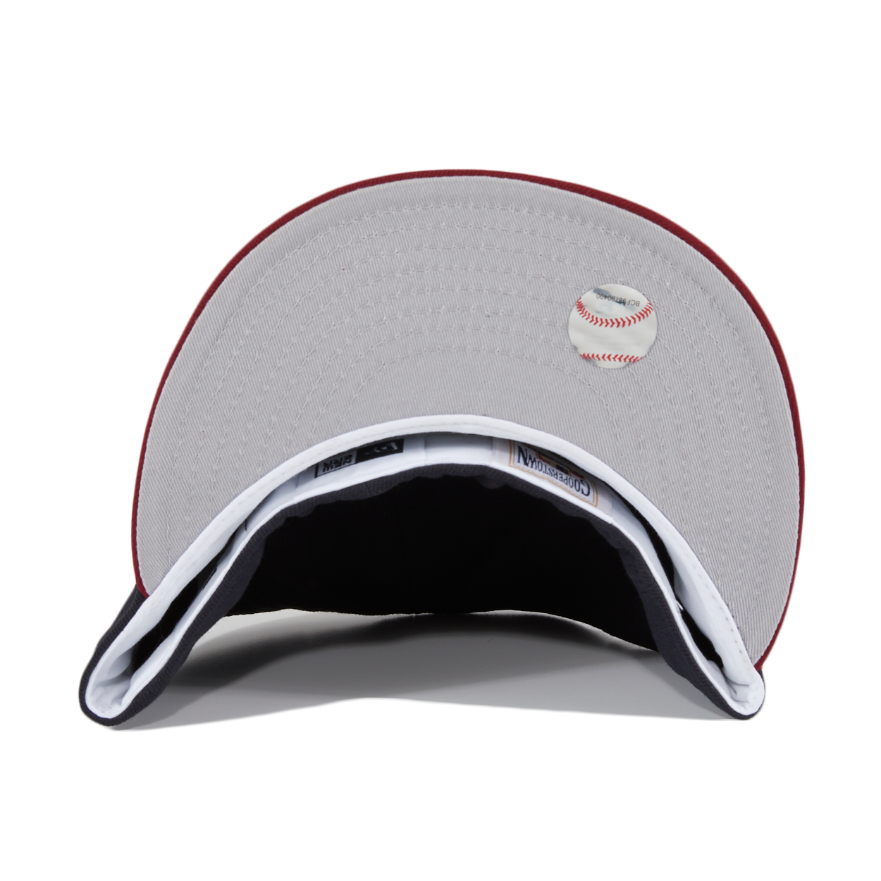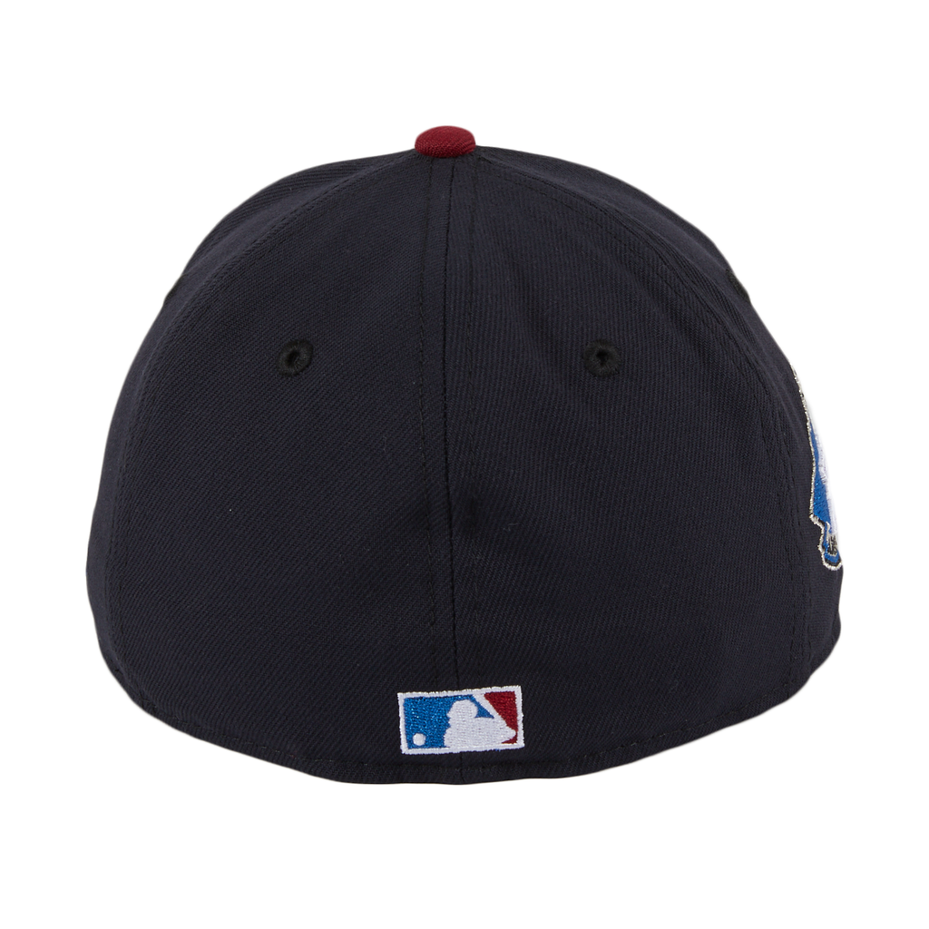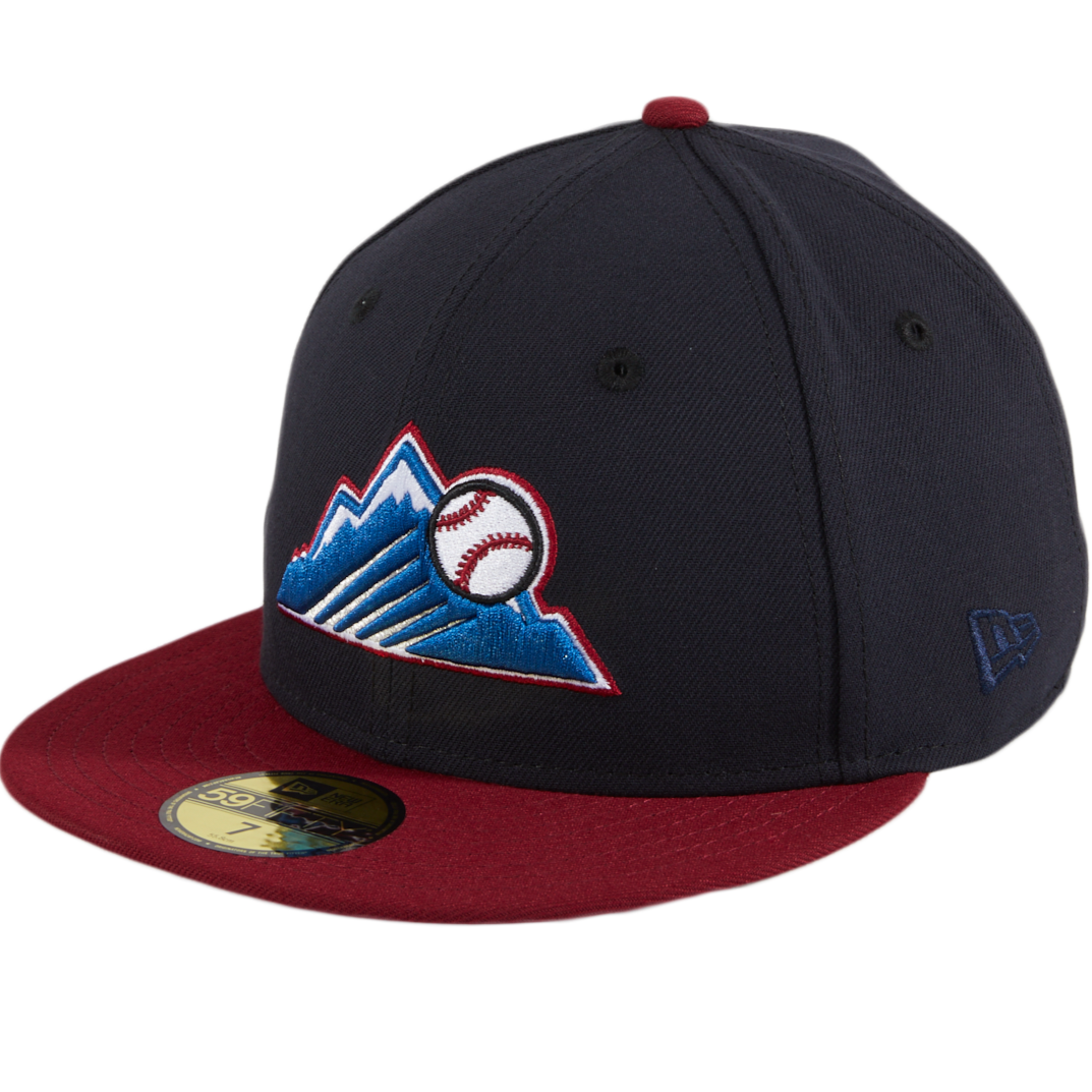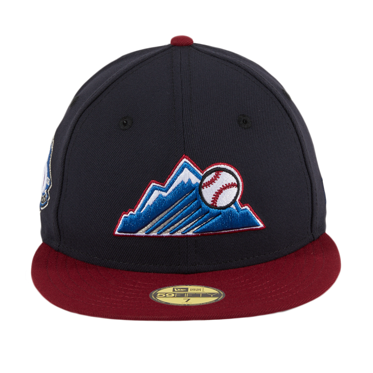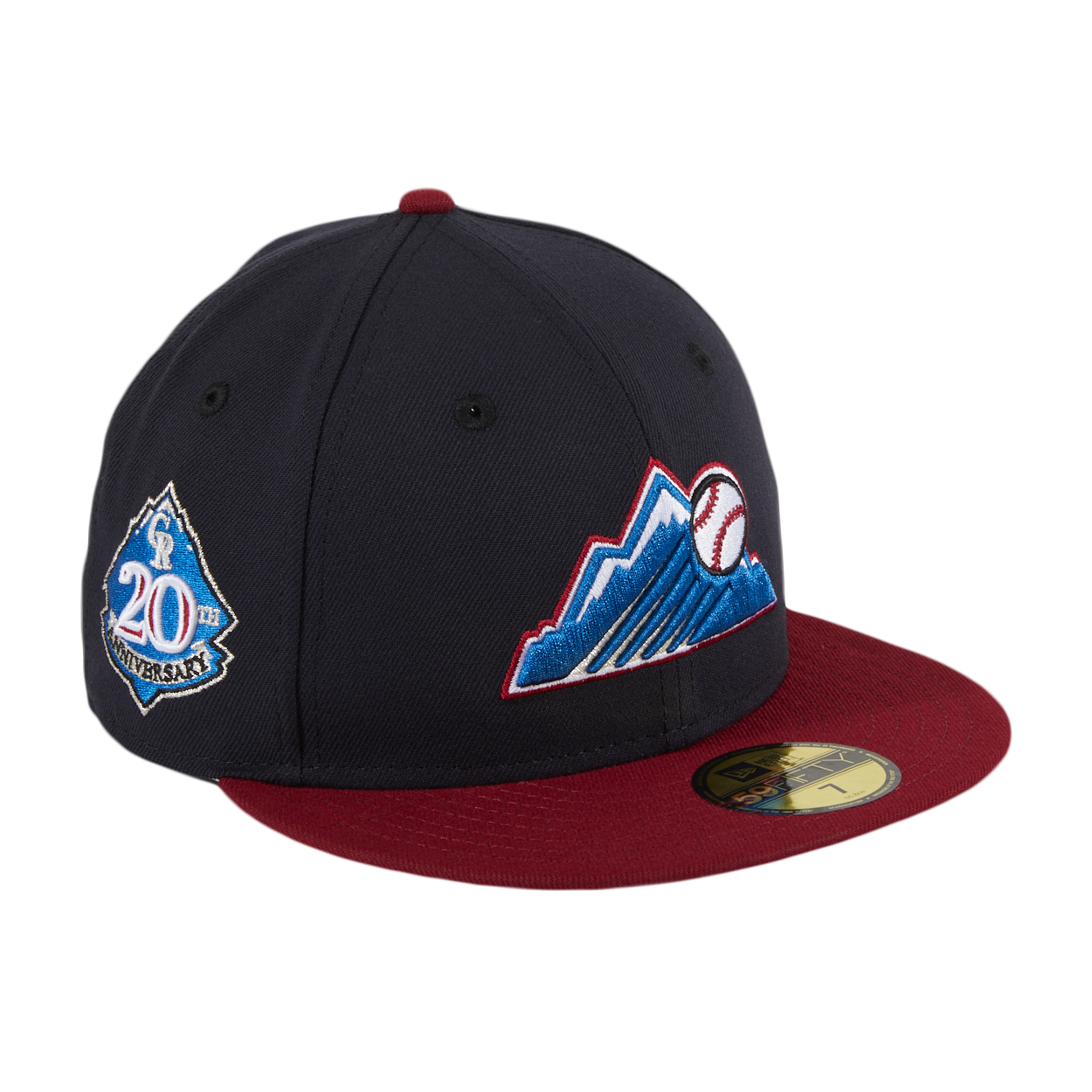 This New Era Colorado Rockies 20th Anniversary 59FIFTY fitted hat is a Hat Club exclusive from their Ice Cold Fashion Collection. The fitted has a navy blue high crown and embroidered eyelets. The fabric squatchee button and flat bill of the fitted is burgundy with a grey bottom under brim. The front panel features the Rockies logo in blue threads as well as the 20th Anniversary side patch on the right panel.