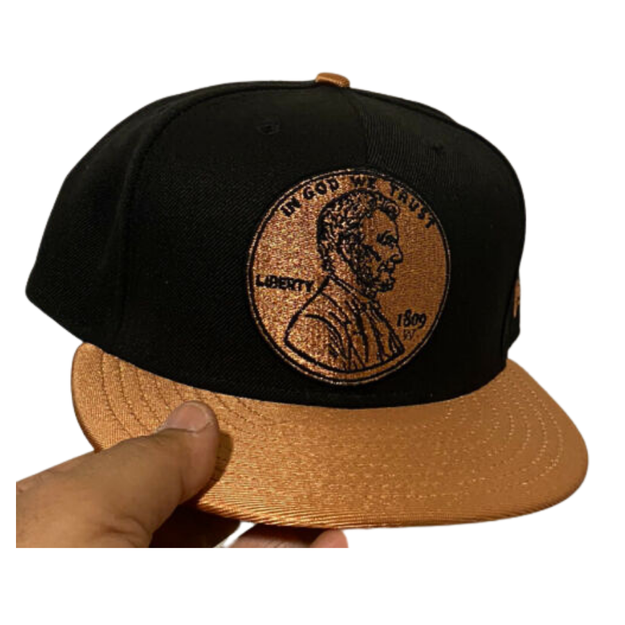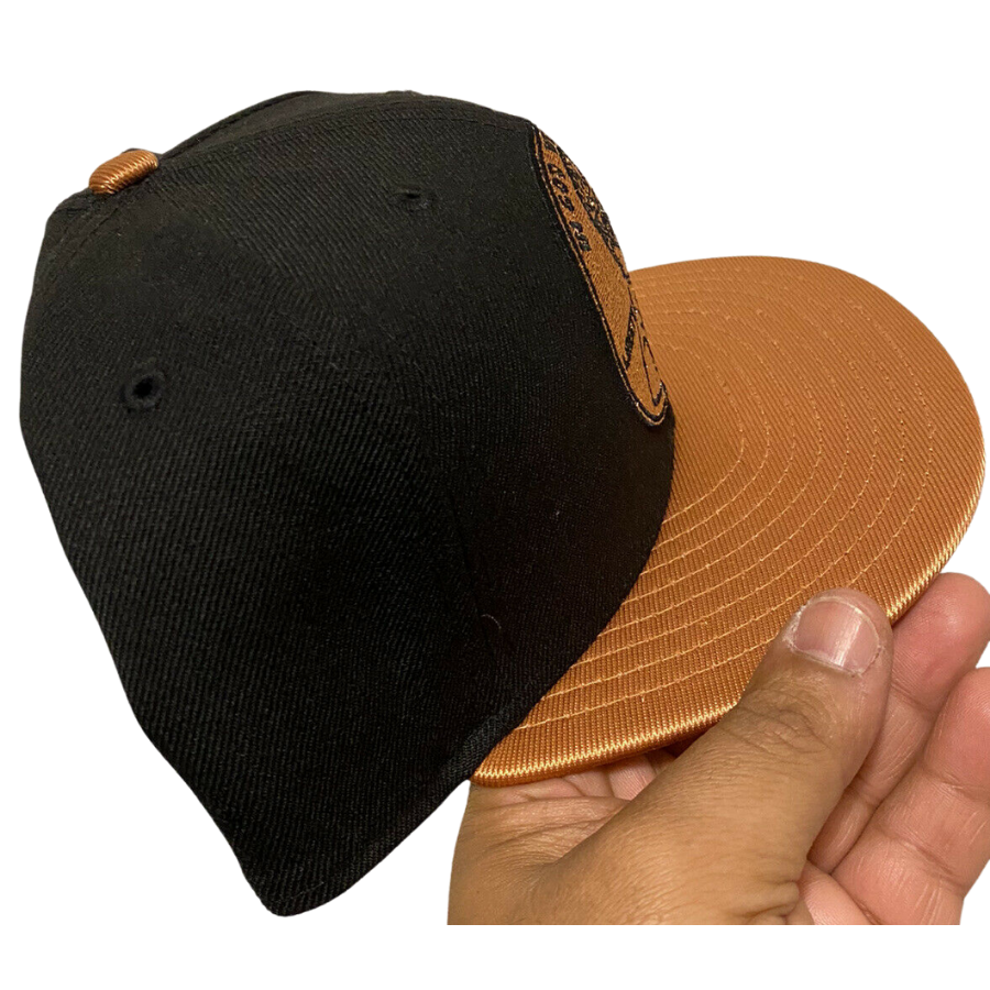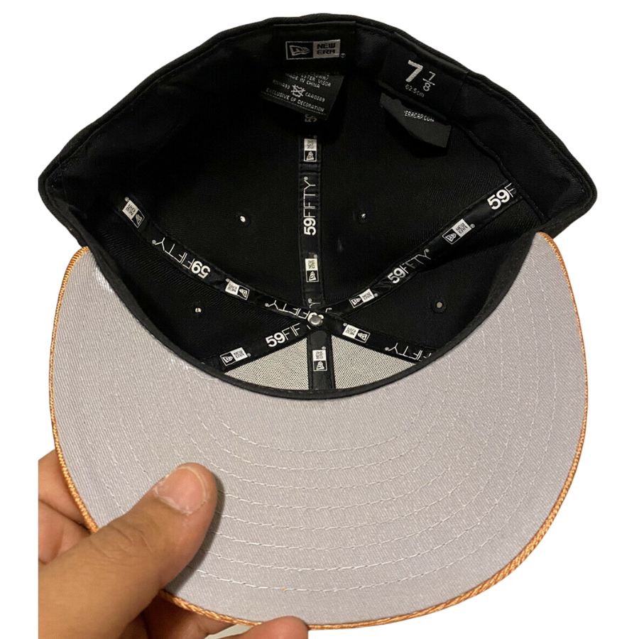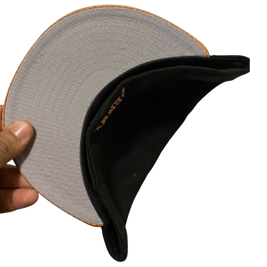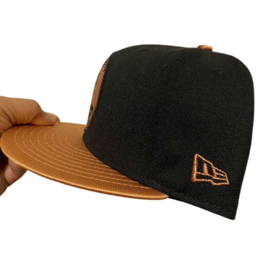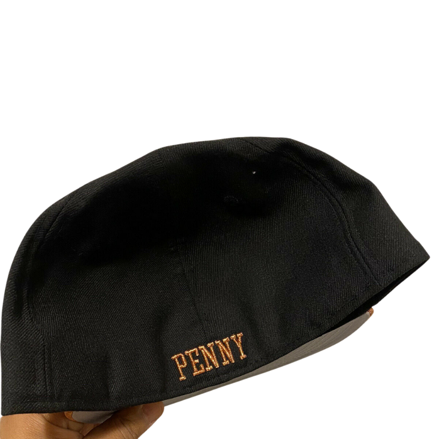 The New Era Copper Penny fitted hat have a copper and black colorway. The six panel structured high crown and embroidered eyelets are black. The fabric squatchee button and flat bill of the fitted cap is copper tone with a grey undervisor and black sweatband. The back of the crown features the sript "Penny" in copper thread as well.
