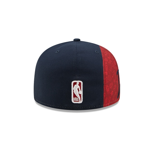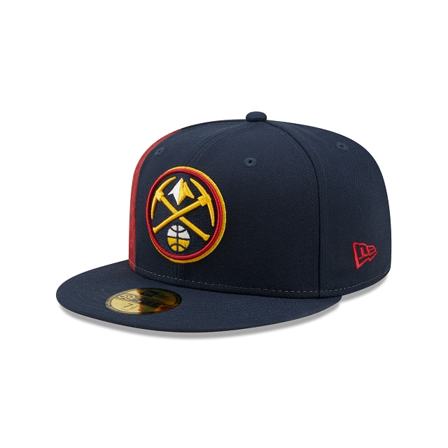The Denver Nuggets Side City Doodle 59FIFTY Fitted Cap features an embroidered Nuggets logo at the front panels, a team script with league inspired Doodle at the right-wear side, and a matching NBA logo at the rear.