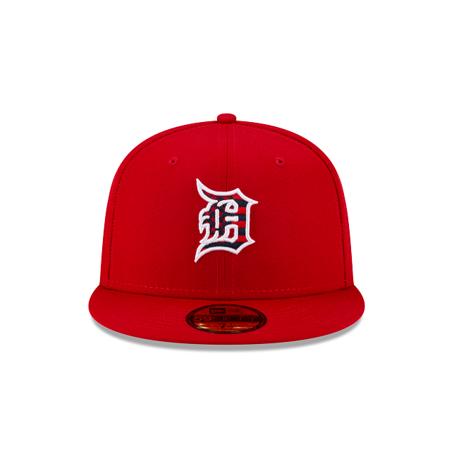 Show your patriotism with the Detroit Tigers Independence Day 59FIFTY Fitted Cap featuring an intricate stars and stripes pattern embroidered within the Tigers logo at the front panels with a city-specific logo embroidered at the right wear side and a matching MLB Batterman logo at the rear.