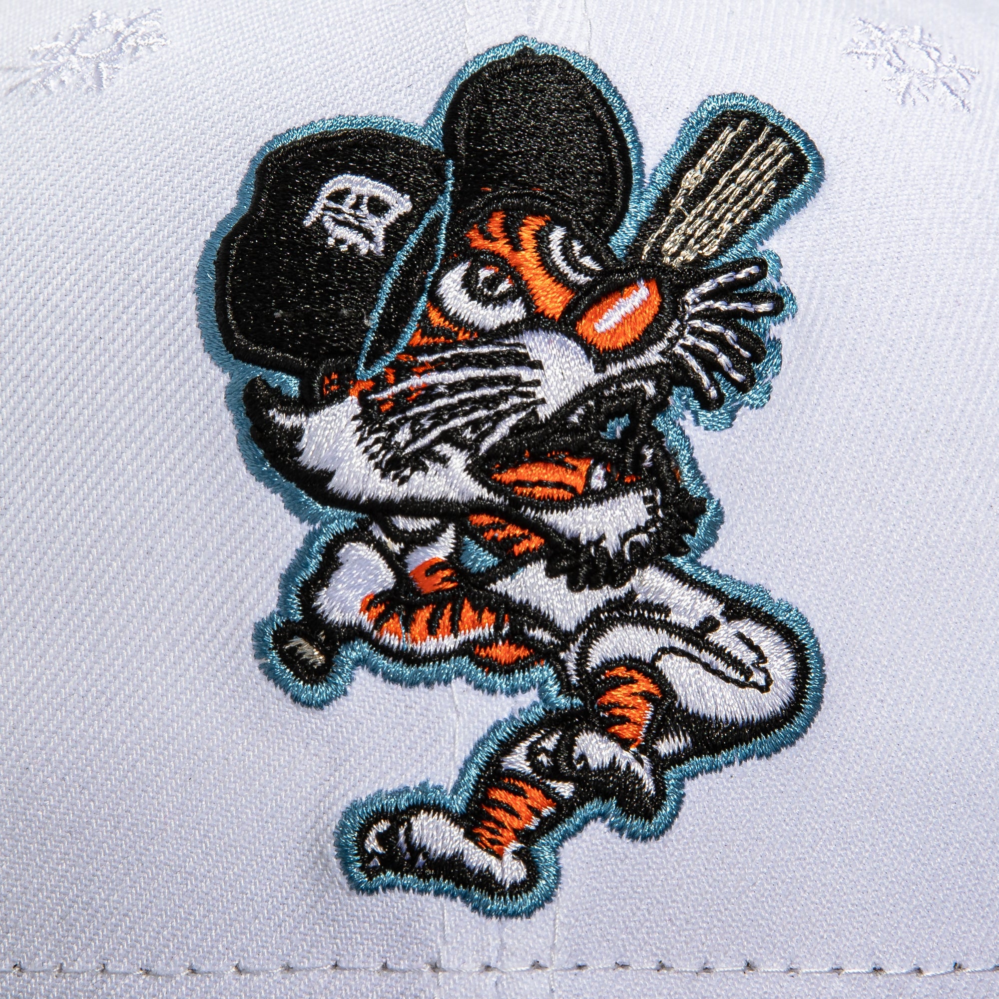 This New Era Detroit Tigers 'Snowman' Stadium 2022 59FIFTY Fitted Hat was released by Hat Club. The fitted has a white six panel structured high crown and snowflake embroidered eyelets with a black fabric squatchee button. The flat bill of the fitted cap is also black with a light blue undervisor. The front panel features the Detroit Tigers logo embroidery and a side patch embroidered on the right panel. The left panel of the fitted displays the New Era logo and the official MLB Batterman insignia embroidered on the rear crown. The fitted hat colorway is inspired by the colors of a snowman.