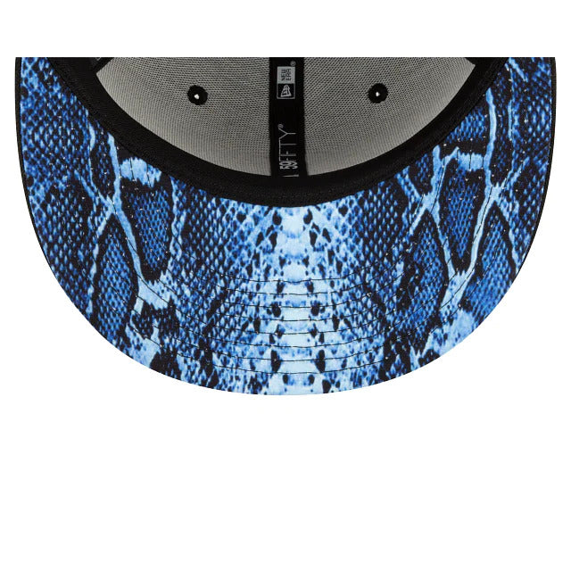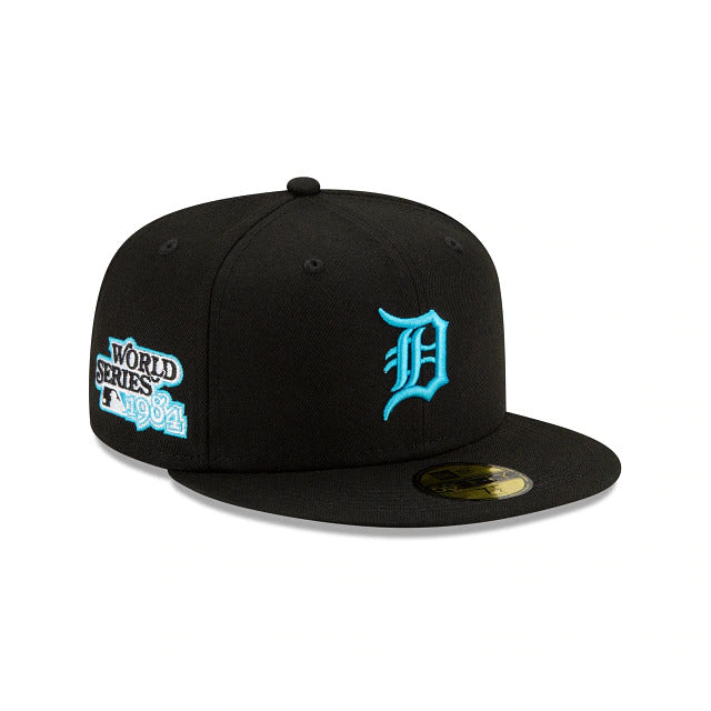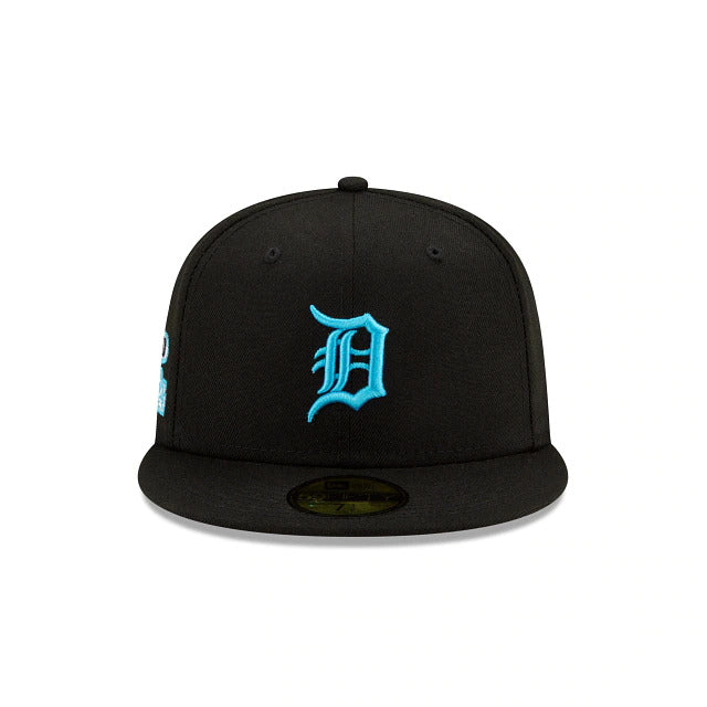 The Detroit Tigers Summer Pop 59FIFTY Fitted Cap features a neon Tigers logo embroidered at the front panels with a World Series patch at the right-wear side and a matching MLB Batterman logo at the rear. Additional details include a snakeskin print undervisor.