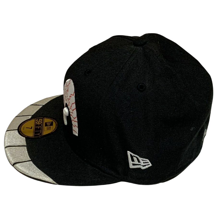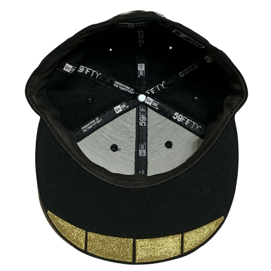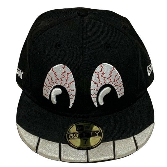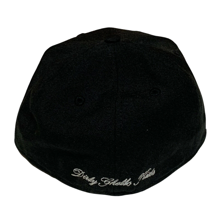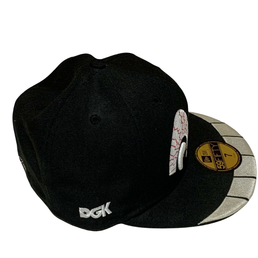 Dirty Ghetto Kids was founded by Stevie Williams as an urban skateboard brand. This New Era DGK 59Fifty fitted hat represents that unique look & style. The structured, 6 panel high crown of the fitted is black, as well as the embroidered eyelets and fabric squatchee button. The brim has a unique look with the majority of it being a solid black but the tip of the brim are designed too look like teeth. The undervisor is similar to the brim with the exception that the teeth on are designed in gold (gold teeth). The front logo displays super large red strained eyes. The iconic New Era "Fly Your Own Flag" logo is embroidered on the left side of the fitted in white thread and "DGK" is embroidered on the right side. The cursive wordmark "Dirty ghetto Kids" is embroidered on the back of the fitted hat in white thread. This is a very unique looking fitted.