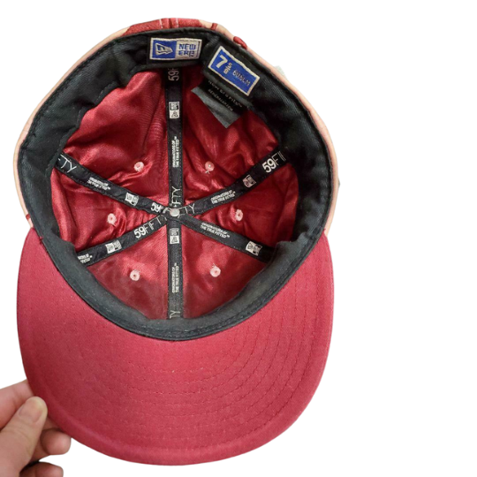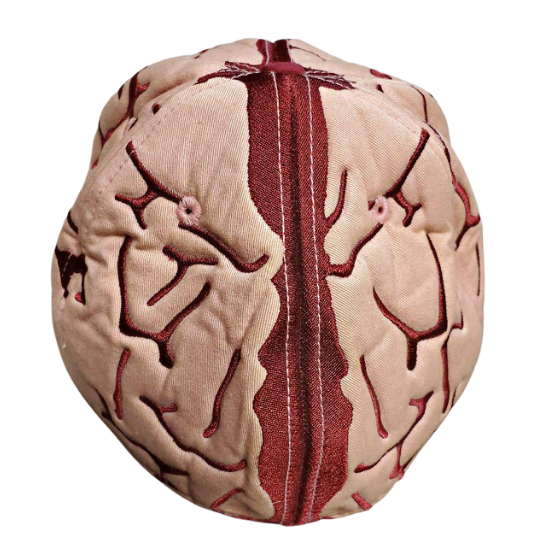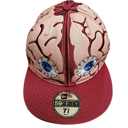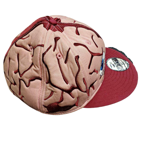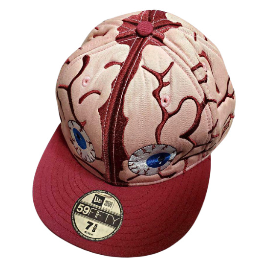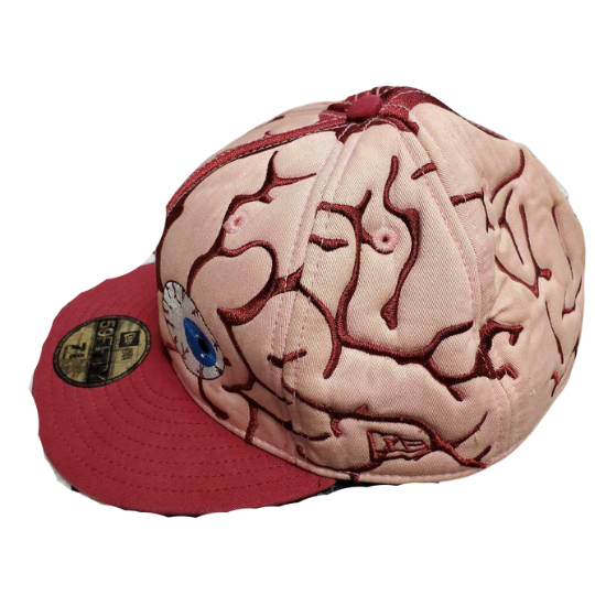 This New 59FIFTY fitted cap is a great addition of our curated Halloween fitted hat collection. The entire cap is 3D and made to look like one creepy giant brain all over the six panel high crown, fabric squatchee button and embroidered eyelets. The front panel features large blue strained eyes. The flat visor of the fitted is crimson color as well as the undervisor with a black sweatband. The inside of the crown is also very interesting as well because of the crimson velvet material its made of. The Halloween "Eye ball & Brains" fitted hat is a great buy to celebrate Halloween but also as a collectors item for those who like to collect rare caps.