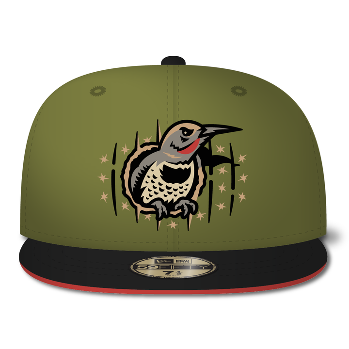 The New Era Flicked Off 59FIFTY Fitted Hat has been designed by PagePerception. The Guilded Flicker is a large woodpecker found in the desert regions of Southwest U.S. Interestingly, they create their nests by pecking cavities in the upper portions of giant saguaro cacti. They must regularly defend their nests from predators trying to steal and eat their eggs. I would be “Flicked Off” too if I still had to defend my nest when I took the time to build it into a freakin’ cactus. For this design I wanted to take advantage of the horizontal crown canvas and use the crown itself to create the “cactus” that the Guilded Flicker looks out from, defending its nest. The visor represents the desert floor with a red under visor giving the design some pop, while referencing the red malar mark found on the bird’s cheeks.
