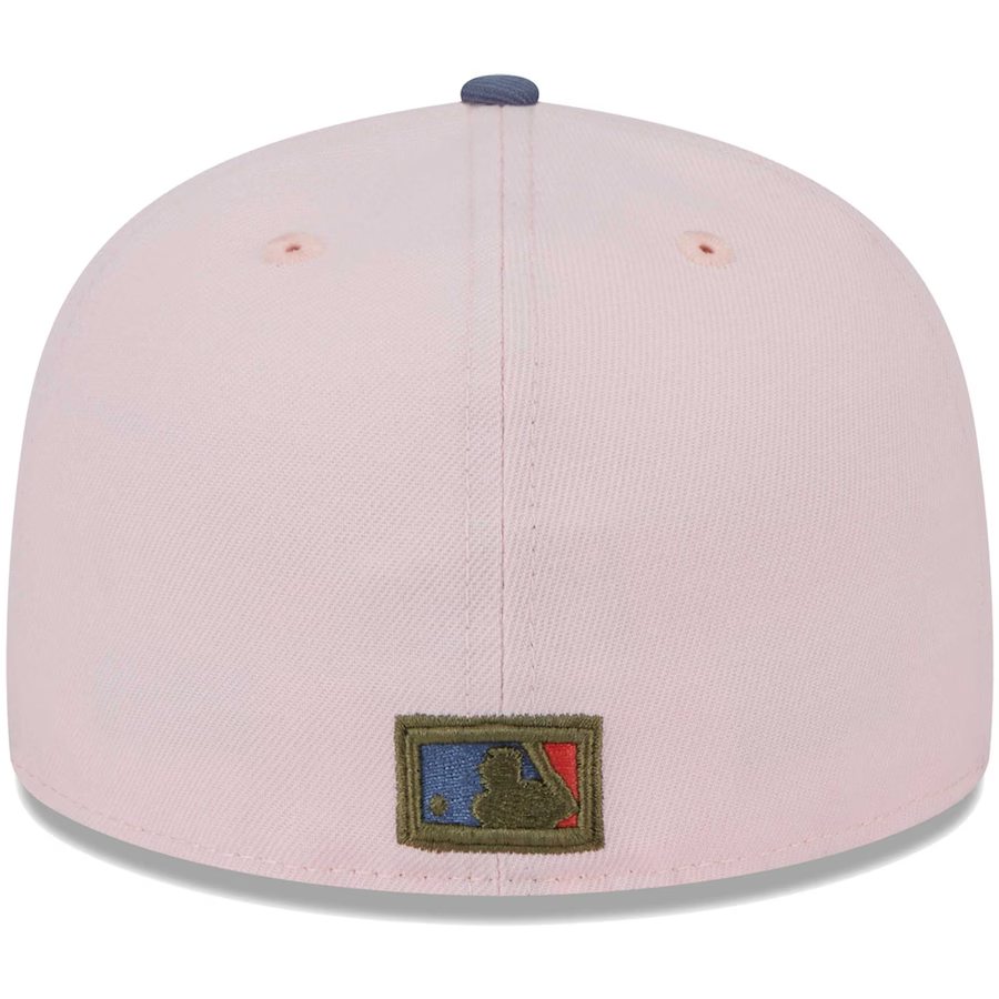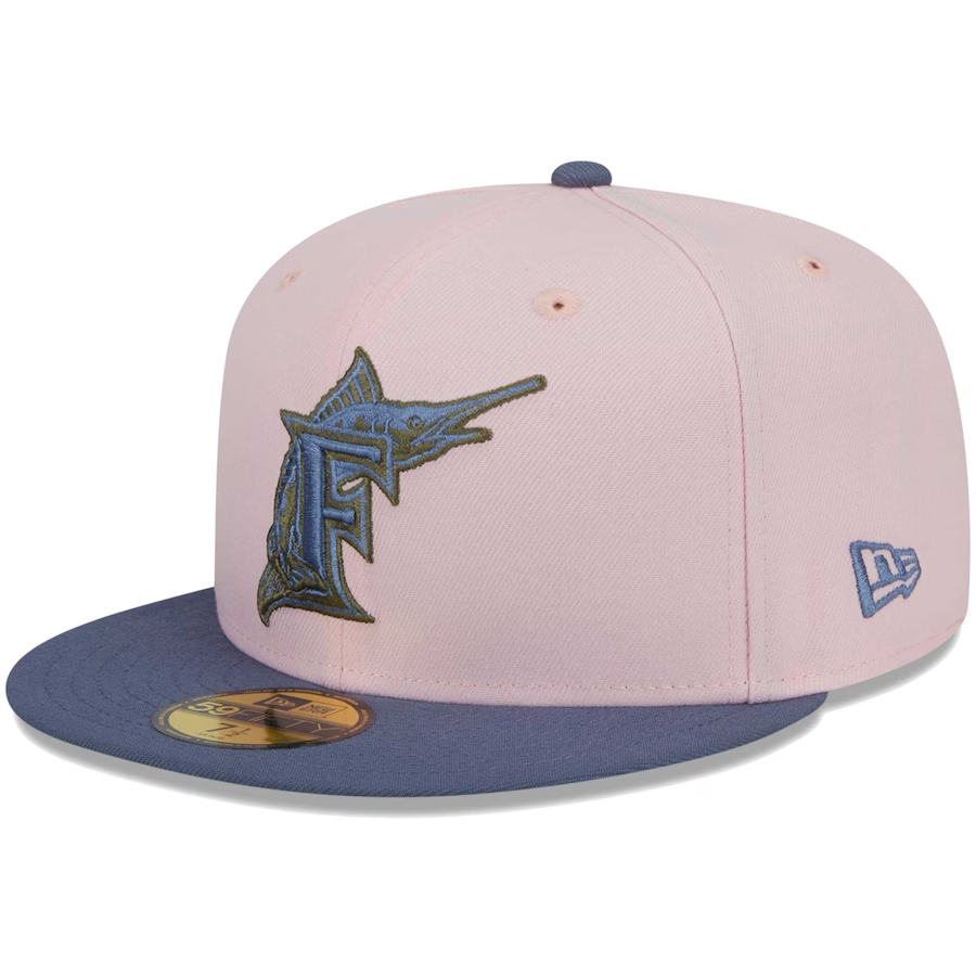 Elevate your Florida Marlins gear with this pink and navy blue colorway New Era 59FIFTY fitted hat, adding a unique touch to your collection. With its structured construction and high crown, it offers a classic and stylish look. The hat proudly displays distinct Florida Marlins embroidery, making it clear where your allegiance lies.