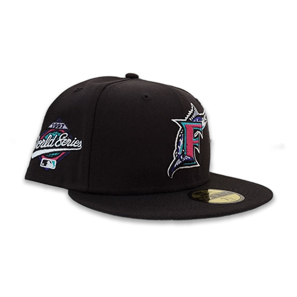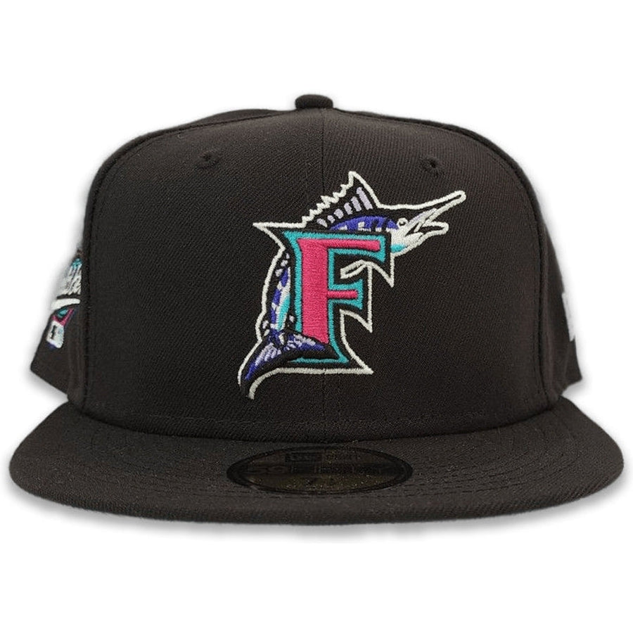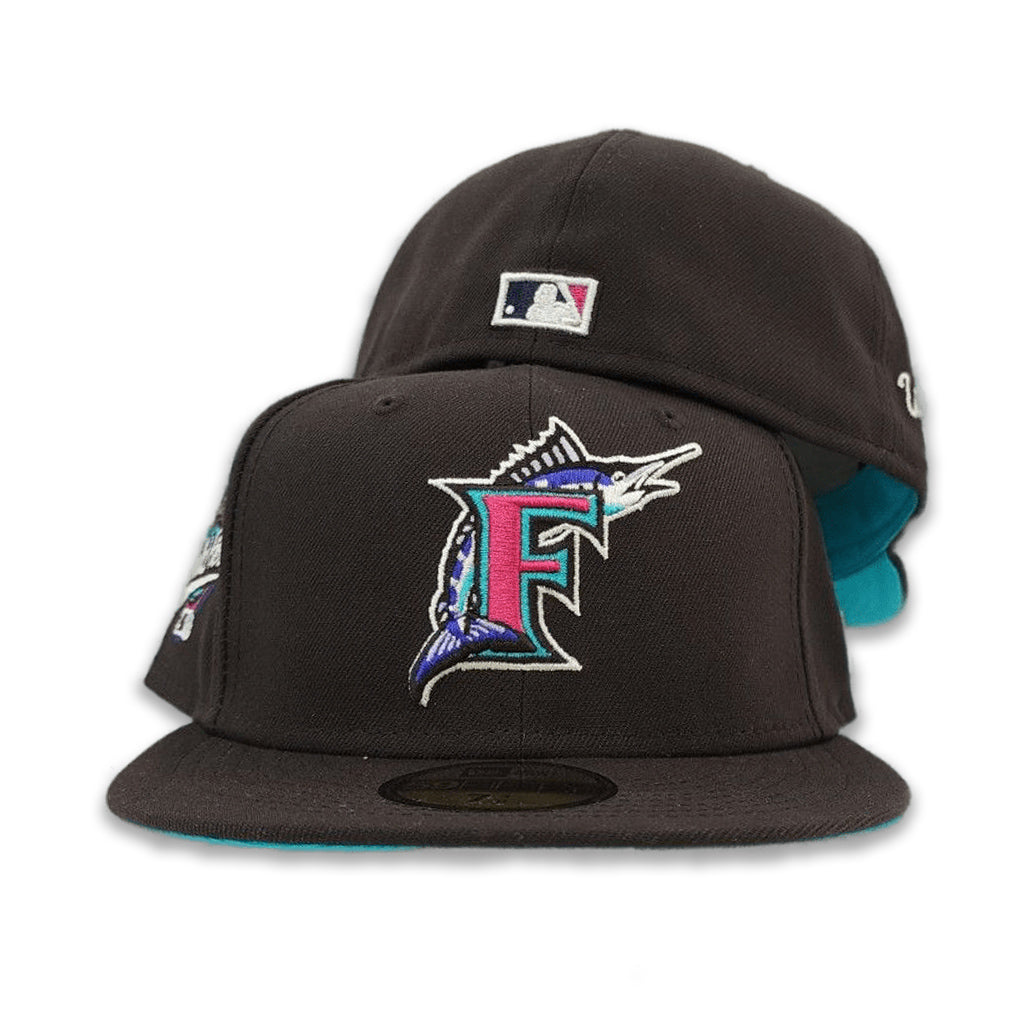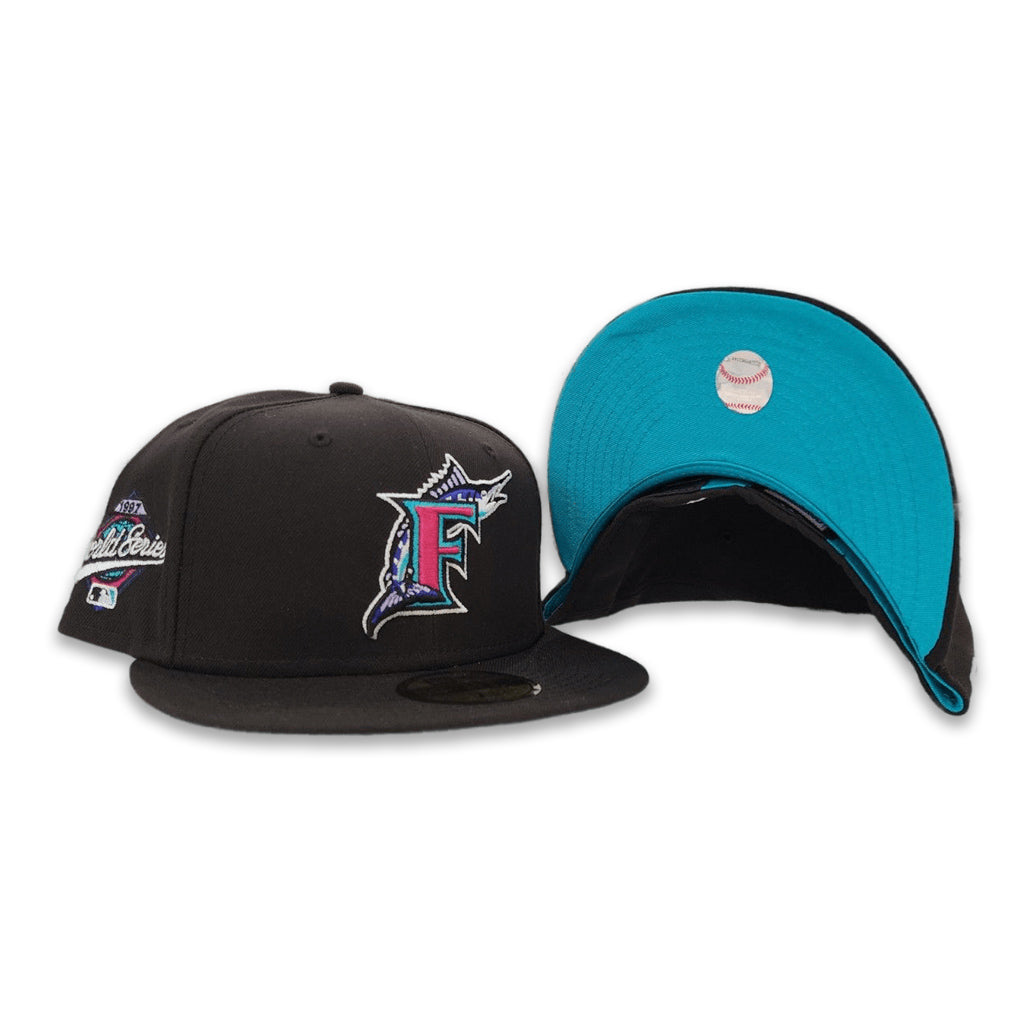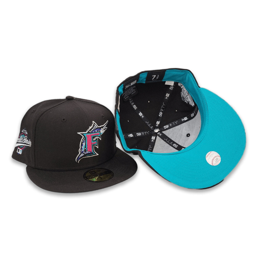 This New Era Polar Lights Black Florida Marlins Turquoise Blue Bottom 1997 World Series Side Patch 59FIFTY Fitted Hat was released by Exclusive Fitted. The fitted has a black six panel structured high crown and embroidered eyelets with a black fabric squatchee button. The fitted cap also has a black flat bill with a turquoise undervisor. The front panel features the Florida Marlins logo embroidery and a 1997 World Series side patch embroidery on the right panel. The left panel of the fitted displays the New Era logo and the official MLB logo embroidery on the rear crown.