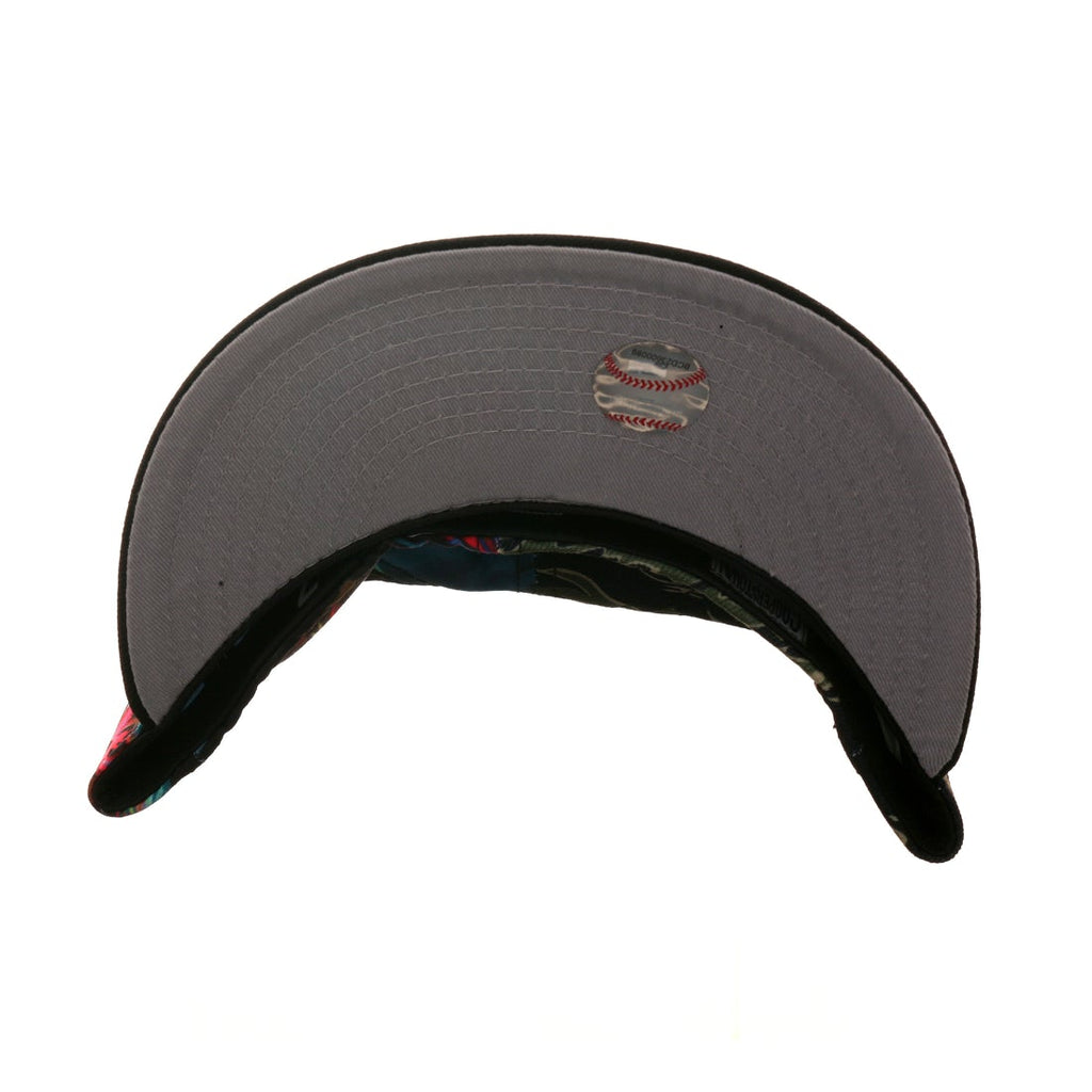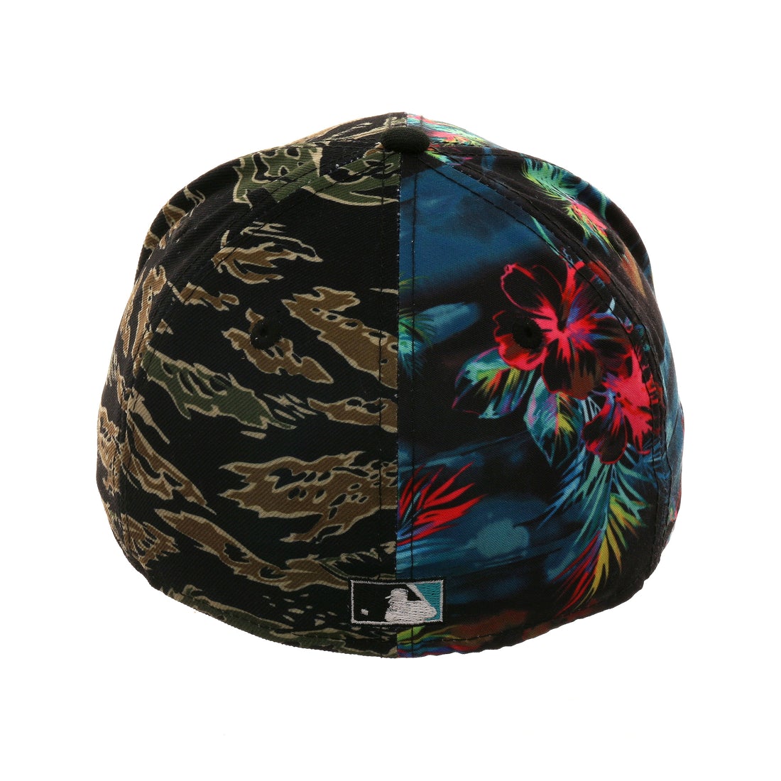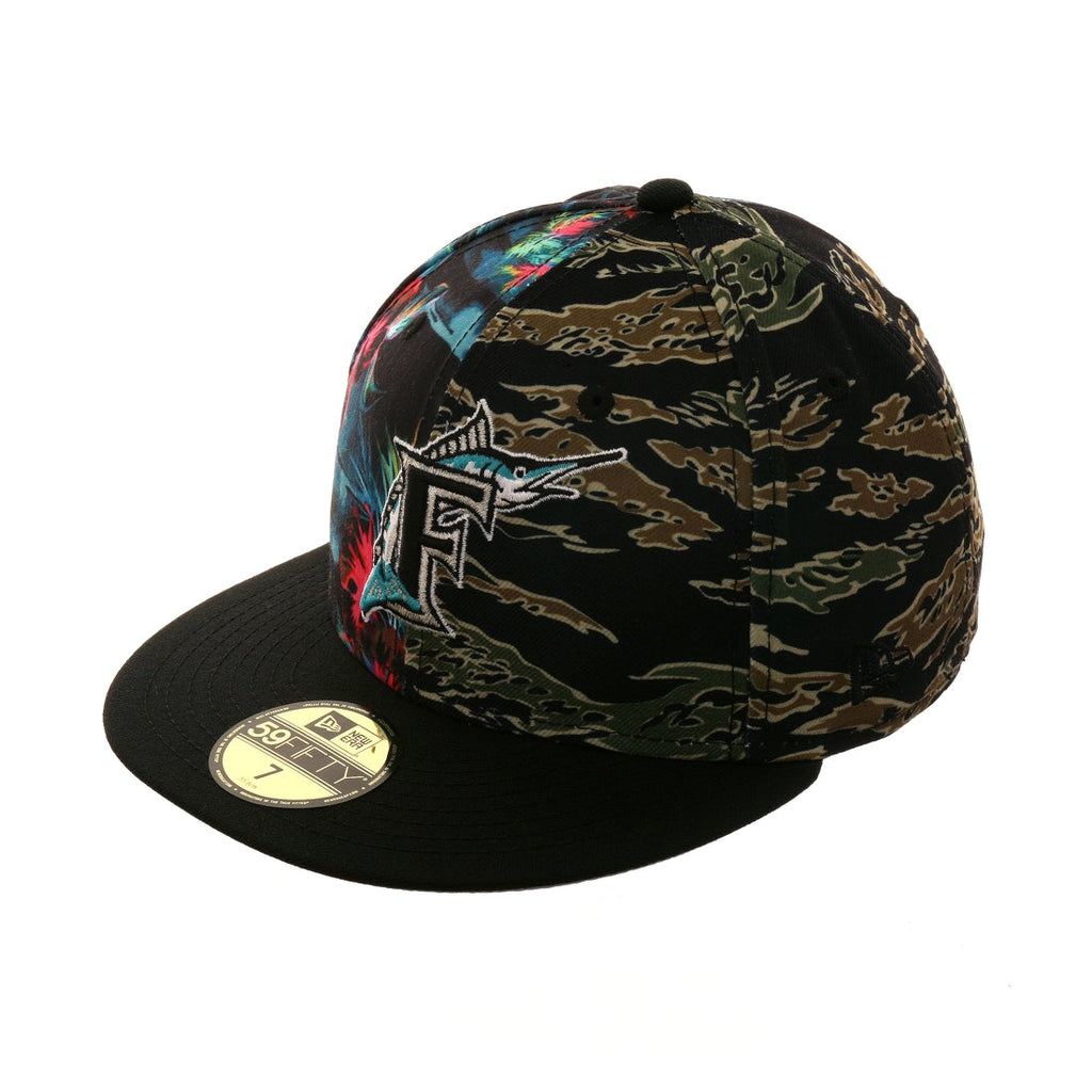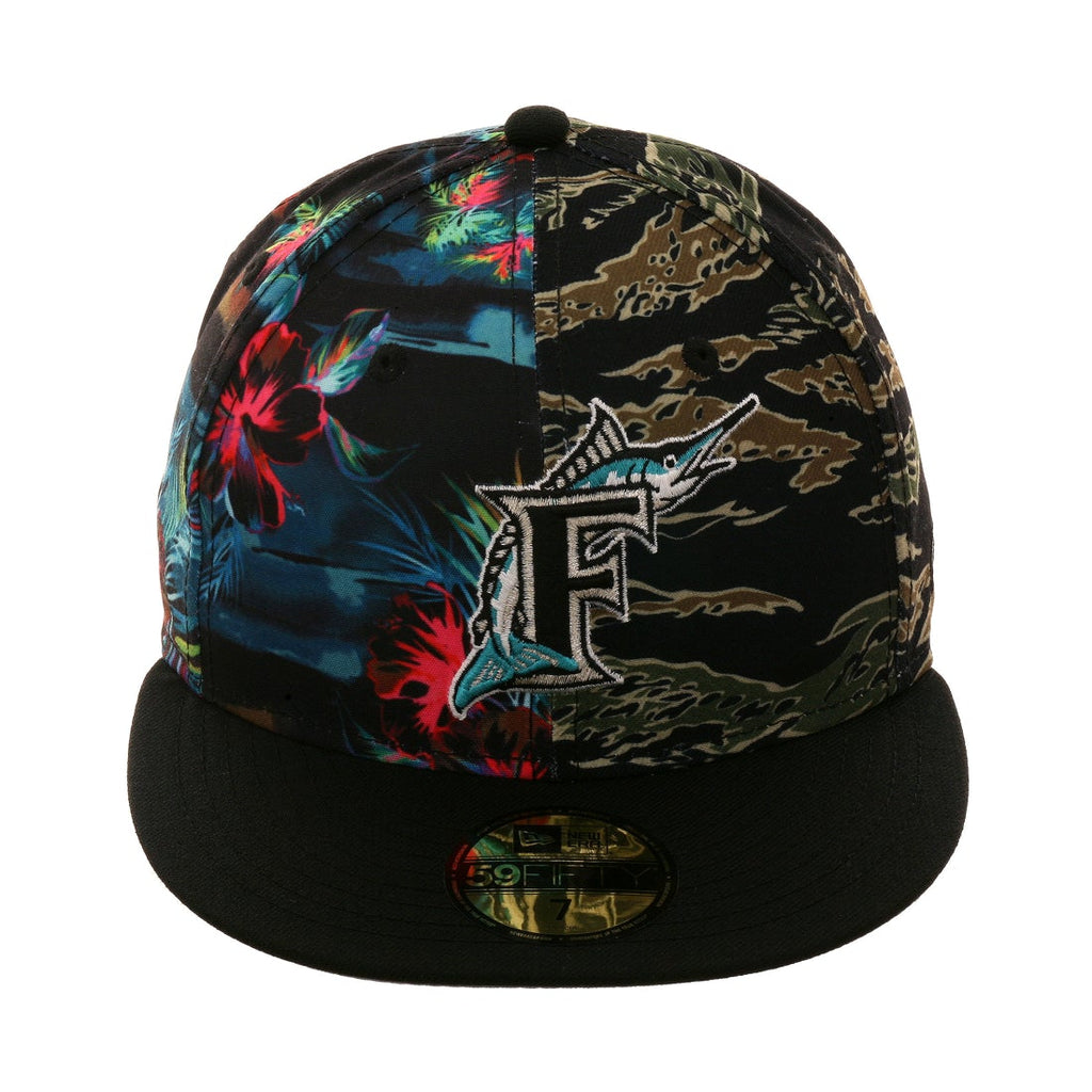 This New Era Florida Marlins fitted hat has a unique two tone split panel. The right panel of the fitted cap are floral patterns with black, blue and a fluorescent pink colorway. The left panel features tiger camo patterns. The front panel features the Florida Marlins logo embroidery. The baseball cap has a grey undervisor and black sweatband.