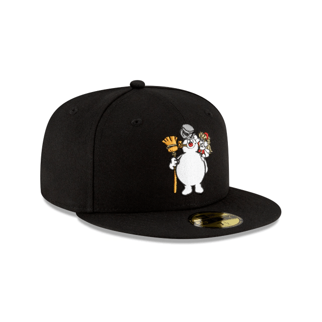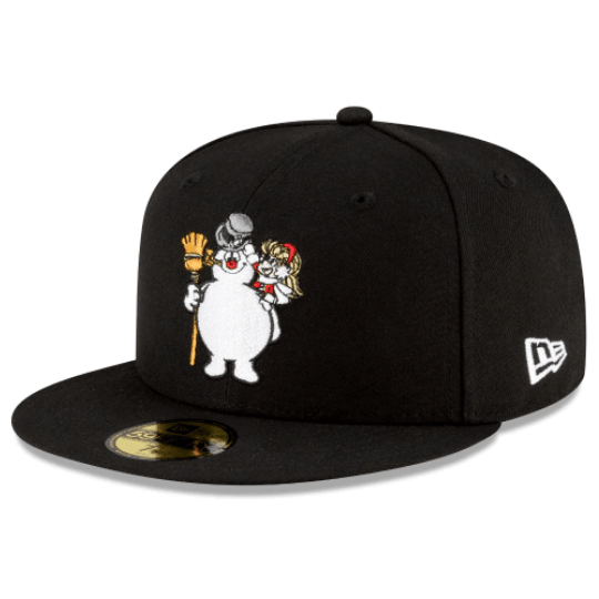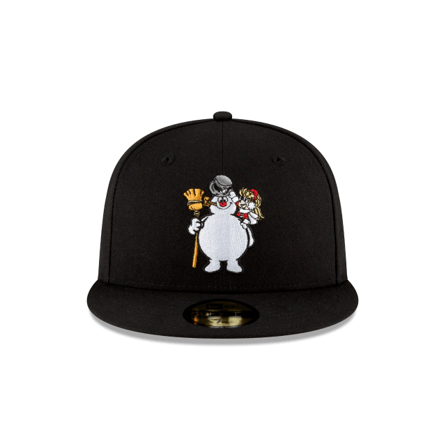 The Frosty the Snowman Karen 59FIFTY Fitted features Frosty and Karen embroidered at the front panels with a white under visor and an embroidered Frosty the Snowman script at the rear.